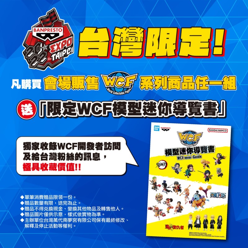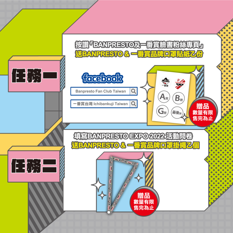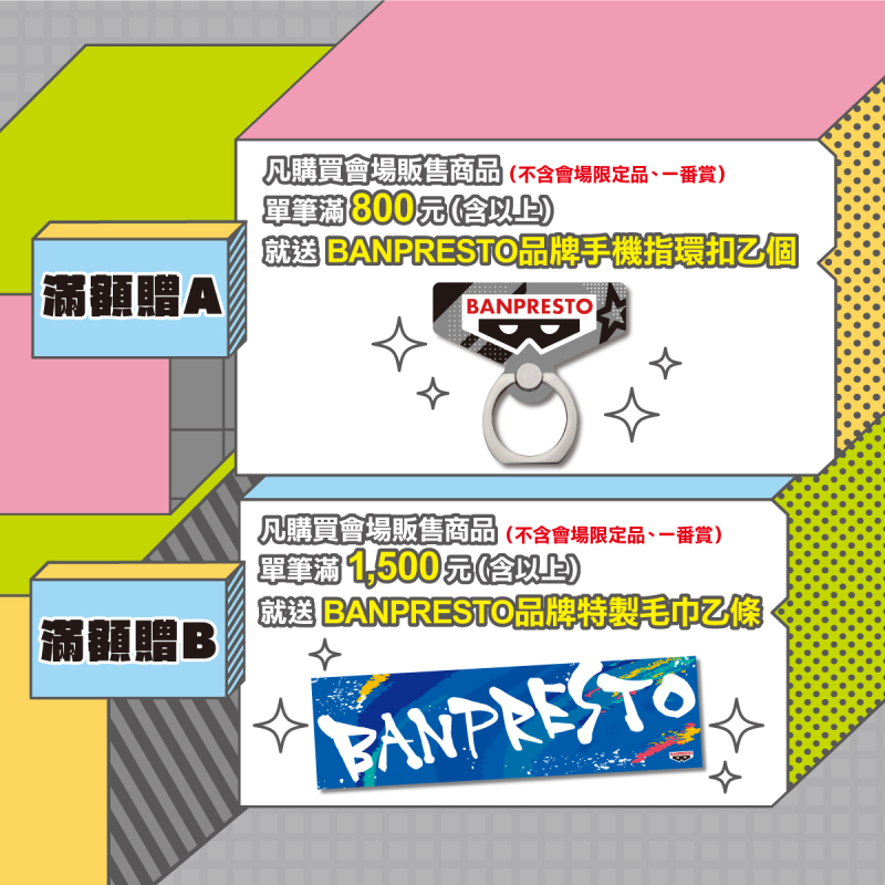 而每次 BANPRESTO 主題展覽都會有的好康活動這次當然也沒有缺席!按讚追蹤 BANPRESTO 及一番賞 Facebook 粉絲專頁「Banpresto Fan Club Taiwan」與「一番賞台灣 Ichibankuji Taiwan」,並填寫問卷即可獲得獨家限量好禮;購買會場販售商品(不含會場限定品與一番賞)滿 800 元及 1,500 元可享限量滿額贈。