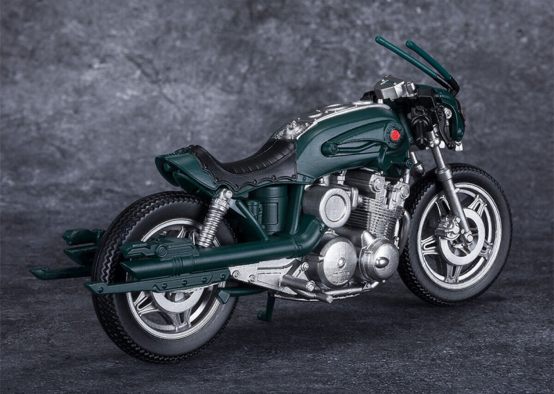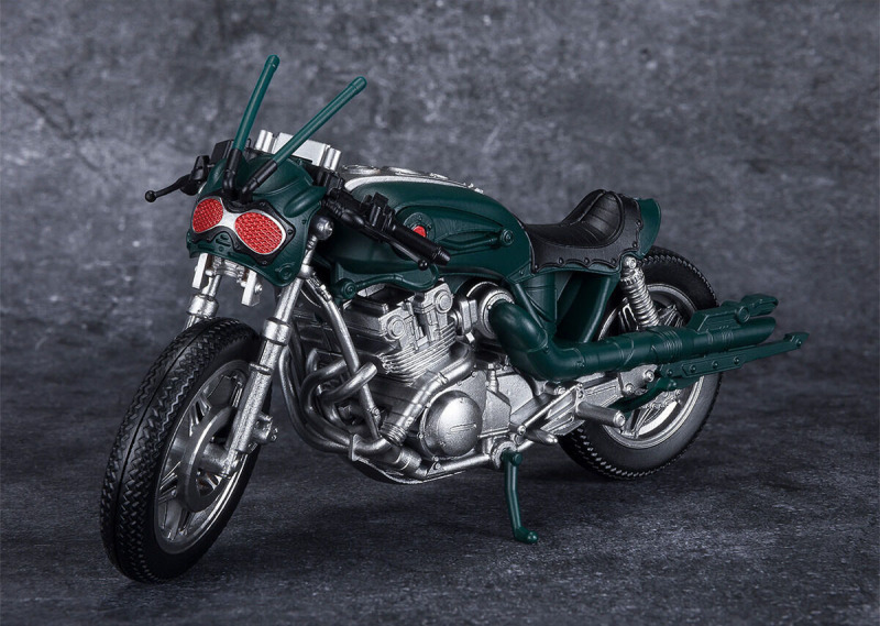 而南光太郎的愛車戰鬥蝗蟲則使用和假面騎士黑日相同的比例製作,無論是蝗蟲造型的車頭、由精密零件構成的引擎與其周圍部件、輪胎輪框等部位,皆透過精密造型與金屬色塗裝再現,十分帥氣。搭配假面騎士黑日本體就能把玩出騎乘場景。