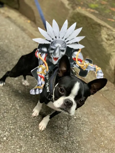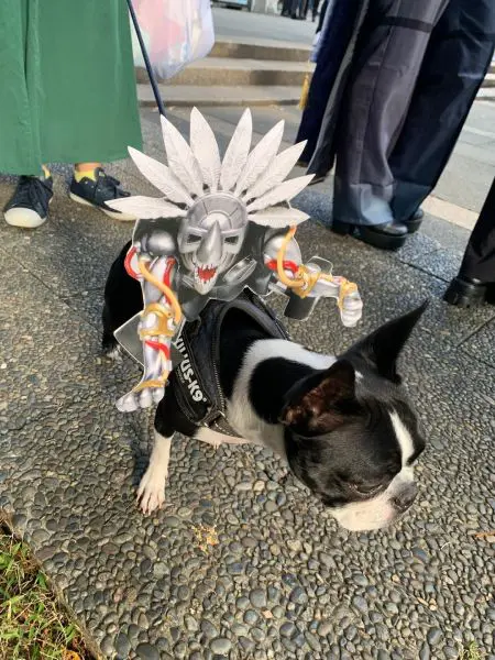 推主自己就是狂熱的 JOJO 粉絲,想說要來參加池袋的萬聖節活動,只有自己出席有點無趣,確定替自家愛犬也好好打扮。剛好也是飼養波士頓犬,就替自己的毛孩盛裝打扮,簡單的在他身上放上了「THE FOOL」替身,讓牠能輕輕背著走路。