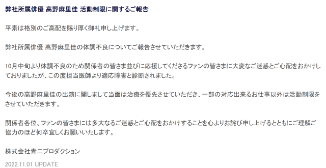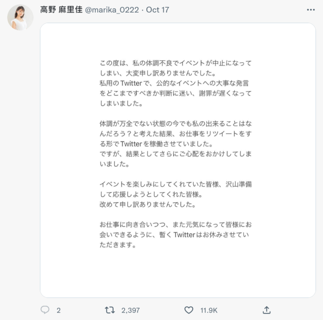 事實上早在 10 月中的時候,高野麻里佳就在個人推特上公告自己身體況欠佳,雖然未明示病情,當時是先行暫停推特上的活動。