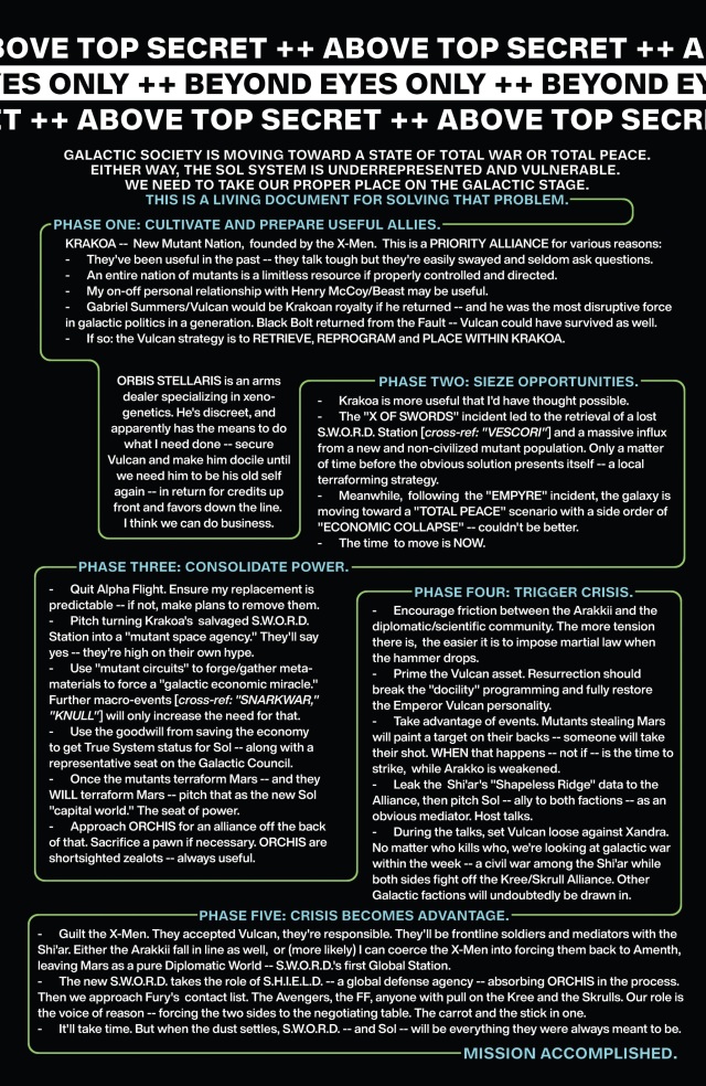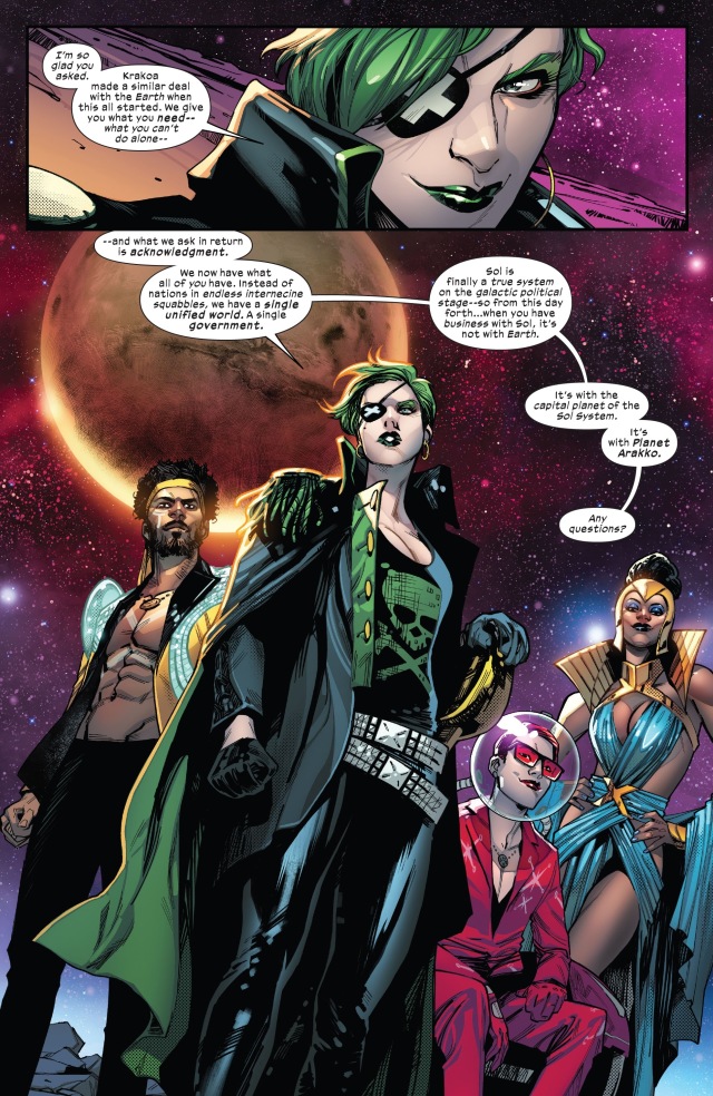 自從克拉科時代(Krakoan Age)開始,變種人便一舉成為了漫威宇宙中最有影響力的霸權之一。除了掌握復活變種人的技術、生產能夠治癒人類百病的藥物,創造出足以比肩汎金屬(Vibranium)的秘金屬(Mysterium),甚至還將火星改造成了第一顆屬於變種人的行星「阿拉科星」(Planet Arakko)。