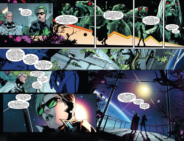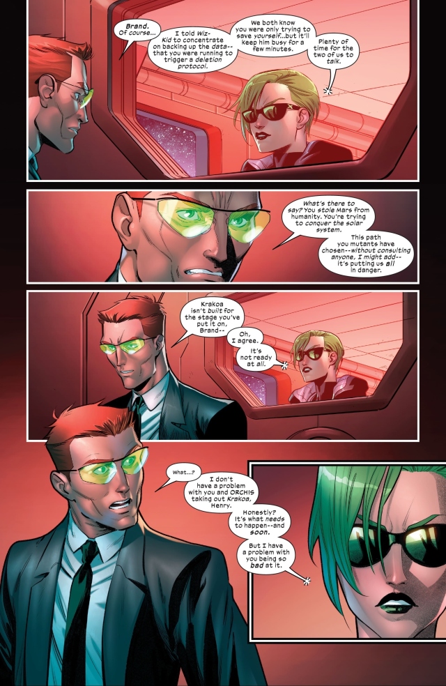而那就是曾經身為「人類的」天劍局(S.W.O.R.D.)和阿爾法飛行隊(Alpha Flight)指揮官的半外星混血變種人,在《秘密入侵》的反擊行動中扮演了重要角色,一頭綠髮的阿比蓋爾‧布蘭德(Abigail Brand)。而最近,她終於揭露了自己這段時間一直在密謀的計畫。
