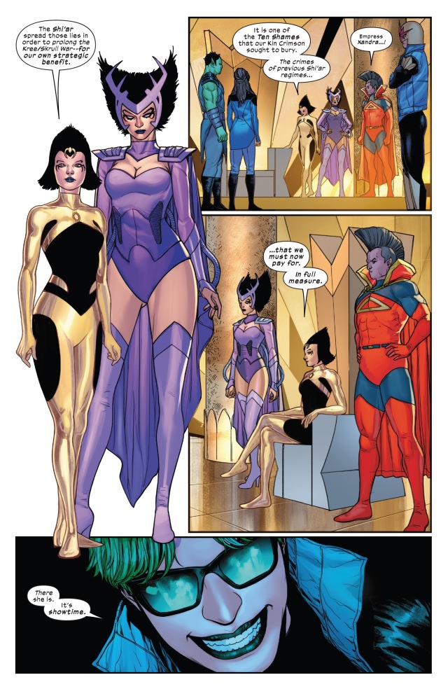 剛好,最近才浮出水面的希阿帝國(Shi'ar Empire)十大恥辱之一便包括了過去曾經秘密煽動克里帝國(Kree Empire)和斯克魯帝國(Skrull Empire)之間的戰爭持續下去的這件罪孽,而阿比蓋爾故意把這項資訊洩露給克里/斯克魯聯盟,讓聯盟駐天劍局外交官Paibok直接找上希阿帝國女皇Xandra對峙。