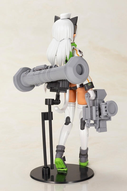 素體部分附有「右方視線普通臉」、「左方視線微笑臉」、「正面笑臉」三種印刷完成表情零件可替換,頭部可替換脫下帽子狀態,雙臂也能替換衣袖手臂、機械手臂兩種造型。武器部分則可替換槍托長度。此外包含腕部、腳部、頭部、臉部零件都能與 FRAME ARMS GIRL 機甲少女系列互換!