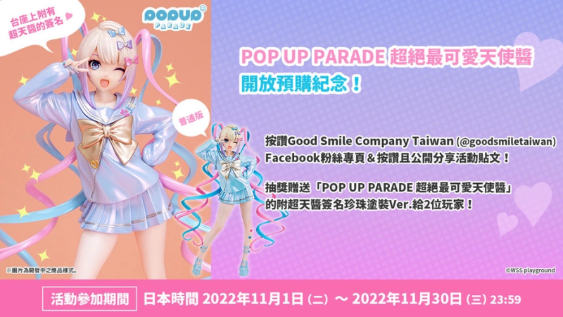 於「GOODSMILE線上商店」訂購此商品,還能獲得將遊戲中可愛貼圖立體化的限定特典「哭哭貓」一隻。此外好微笑還舉行了開放預購紀念抽獎活動,只要參加就有機會獲得附上「超天醬簽名特製台座」的「POP UP PARADE 超絕最可愛天使醬 珍珠塗裝Ver.」!