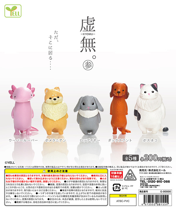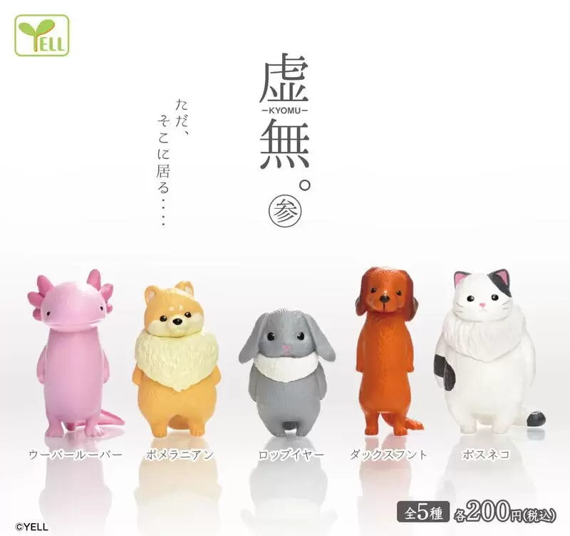將可愛的動物以放空、癡呆放空表情呈現的 YELL「虛無」動物系列轉蛋,在前兩彈的空虛動物後,這次第三彈再推出五款呆呆站著的:墨西哥鈍口螈(六角恐龍)、博美犬、垂耳兔、臘腸犬以及巨大的BOSS貓,發直的雙眼和木訥立正的姿勢,看起來有點懷疑人生;雖然造型簡單但搭配小道具或生活場景,就能展現出無助的空虛感...