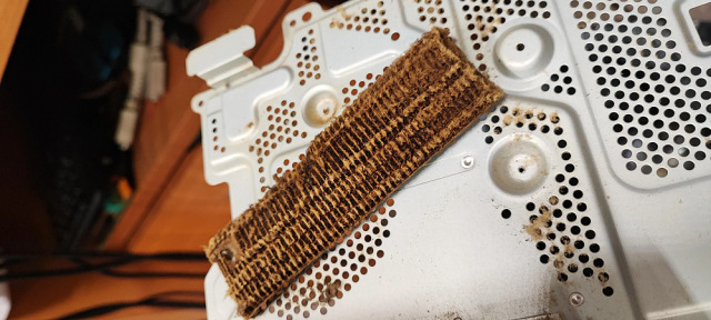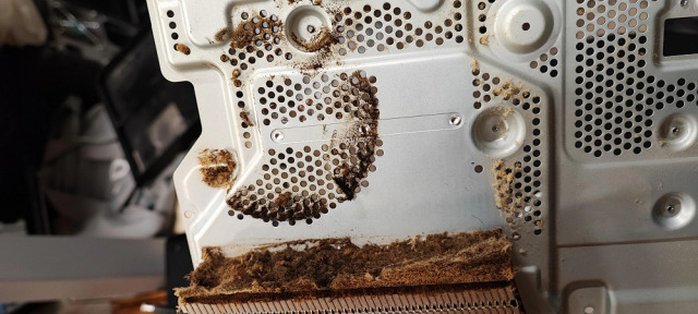 在主機的各個構造中,都堆積著一層黃黑色、或說深橘色的汙垢,身邊有人長期抽菸的話,一定認得出這就是菸垢的顏色。而這些菸垢又和自然堆積的灰塵卡再一起、彼此交纏,最後變成了帶有濃濃菸味、帶黏性的頑固髒汙。