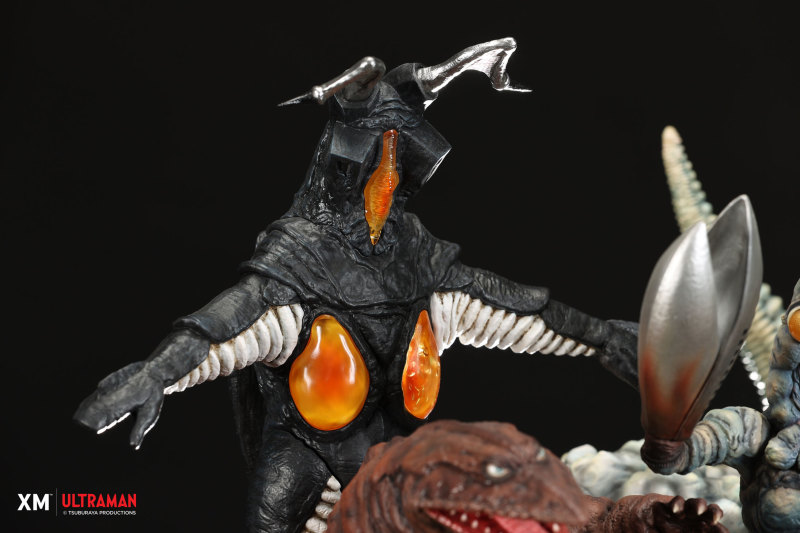 這次參戰的怪獸一共有傑頓、紅王、巴爾坦星人、涅羅剛、鐵列斯頓、貝姆拉、哥摩拉、達達,全都張牙舞爪、兇狠地朝向超人力霸王撲來,紅王手裡還拿著一塊巨石真的很派!怪獸部分皆以手工塗裝展現逼真生物感與漸層色,力霸王這邊則是仔細刻畫出因動作產生的服裝皺摺,還可以在地台上瞧見毀壞的大樓、橘紅色的爆炸特效、灰煙......等,入手之後好好欣賞每一隻怪獸的細節一定相當過癮!真的是一款超猛的雕像啊。