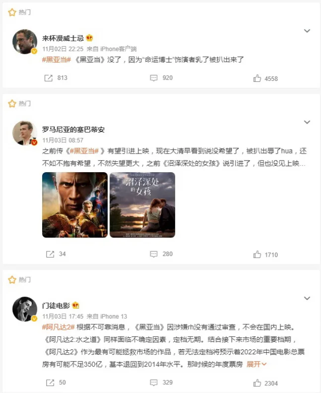 根據微博消息,近期除了《黑亞當》外,迪士尼發行的《阿凡達2:水之道》(Avatar: The Way of Water) 與索尼《沼澤謀殺案》(Where the Crawdads Sing)同樣遲未定檔。近年好萊塢在中國市場頻頻碰壁,最根本的問題還是中美之間的政治關係發生變故,導致雙方在各領域對對方祭出的一連串經濟制裁,也迫使五大片商將市場重點,轉向亞洲其他觀眾。