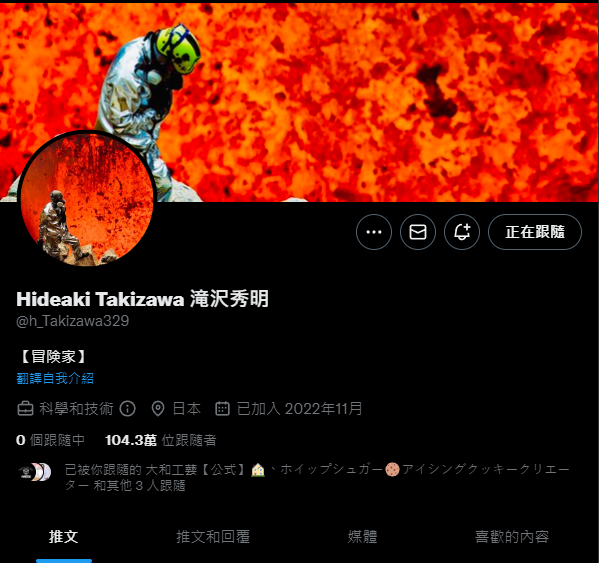 有趣的是,在今日瀧澤秀明所新辦的Twitter帳號上,不過在瀧澤的個人簡介中簡單寫下了「冒險家」三個字,這不僅對應過去他過去曾為火山研究相關的消息,在卸下傑尼斯副社長職務的他,更還傳出瀧澤秀明有意進一步做相關研究活動。