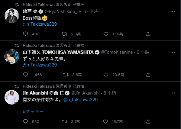 但不論是哪一種說法,也都有待瀧澤秀明日後在Twitter上的進一步動作,不過對於「前傑尼斯成員」赤西仁、山下智久、錦戶亮的聲援,也的確讓不少網友不禁聯想到成立新經紀公司的傳聞。