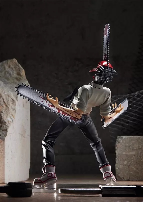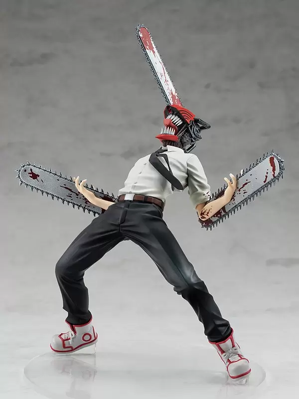 「POP UP PARADE 鏈鋸人」PVC模型,尺寸約高 185 mm,以淀治變身為鏈鋸人後,表演腰骨有多軟 Q 的造型為基礎,還原利牙、吐舌,彷彿仰天咆嘯的狂氣姿態!質感的血紅鏈鋸頭部、複雜的機械結構,頭頂的鏈鋸和雙手也鑽出殺氣十足的電鋸刀片也施以血跡塗裝,再現劇中活躍、殘暴的場景!