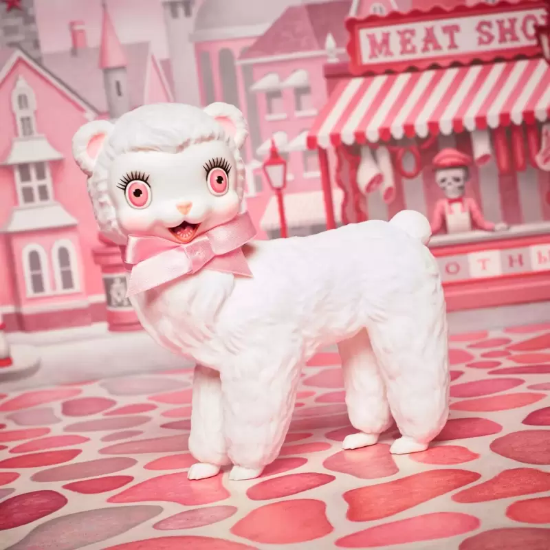 MARK RYDEN × 芭比娃娃聯名主視覺的「Pink Pop Barbie Doll 粉紅POP芭比 」,將粉紅色芭比帶入瘋狂的甜蜜夢境!頭頂著誇張的粉紅色大蓬頭髮型,身穿與頭髮相配的粉色連衣裙、糖果色的條紋褲襪;皮膚則是無血色的慘白,手上還提著肉塊造型的小包,另外還配有一隻睜著大眼睛的奇怪白色小犛牛(yak)和一盆有著人臉的微笑鮮花花盆,打造出 Mark Ryden 標誌性的衝擊視覺效果。