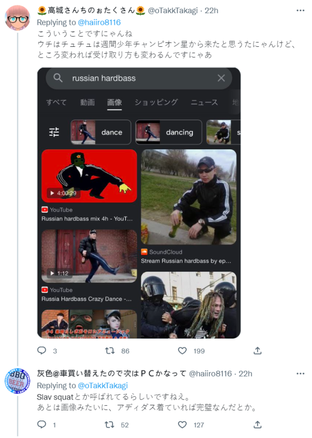 雖然在國外通常被叫做「亞洲蹲」,但其實也有人認為是「Slav squat」( 斯拉夫蹲 ),這也在網路上成為迷因過,會以斯拉夫人穿著黑色運動套裝的樣貌,擺出蹲姿並且展現自負的神情。
