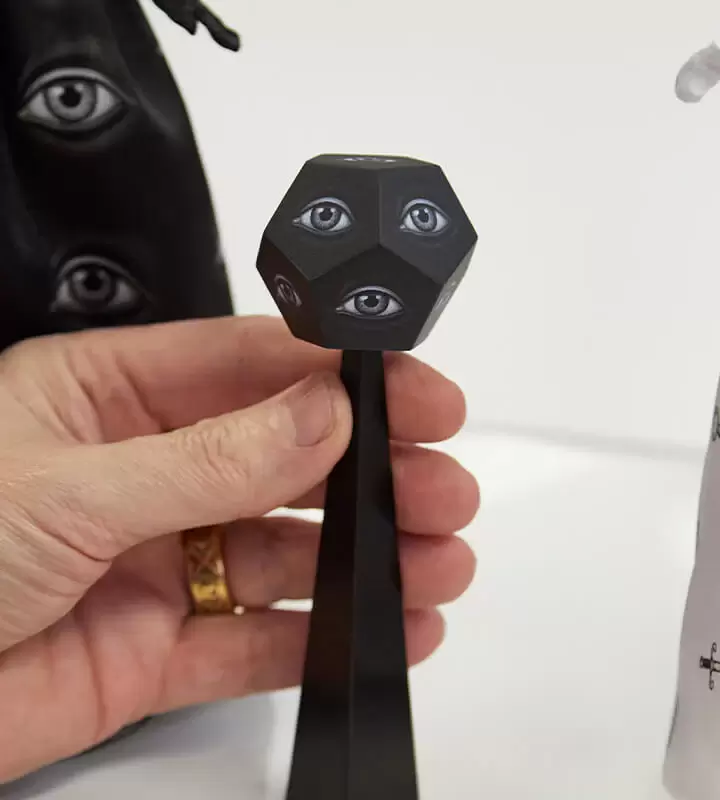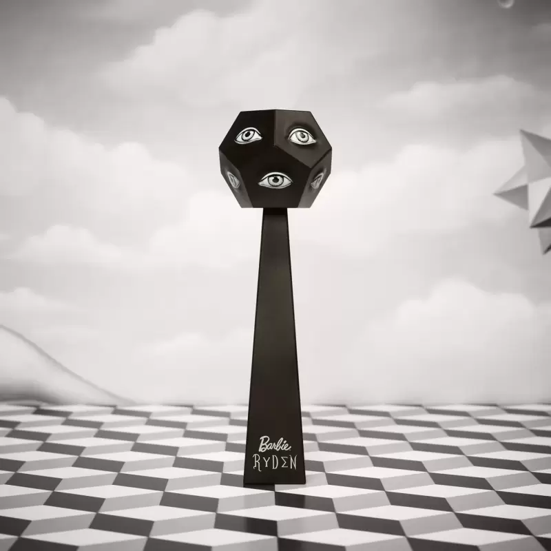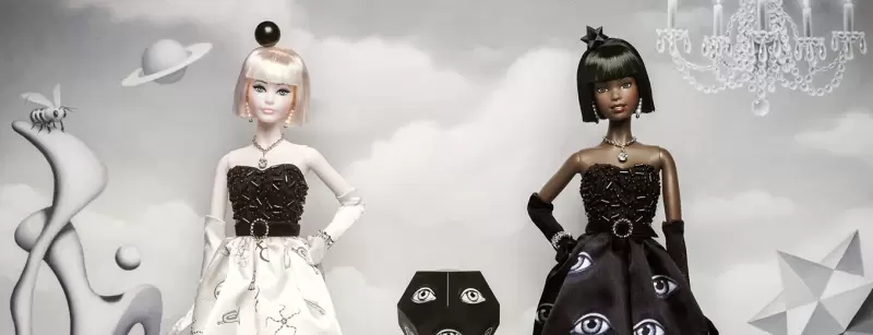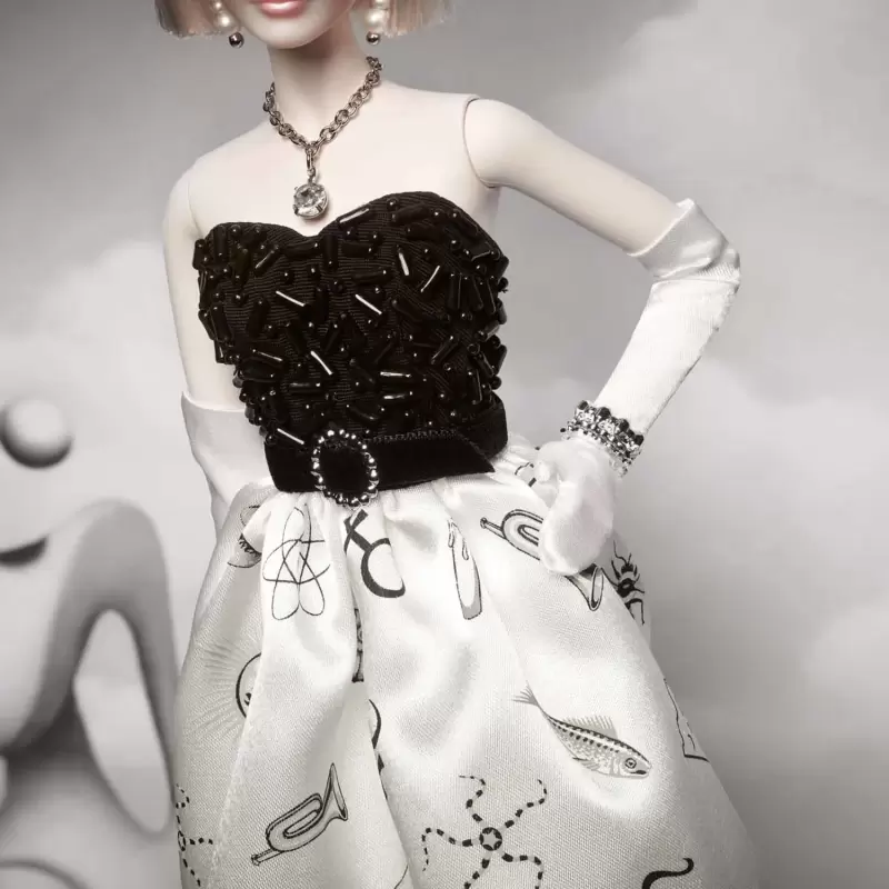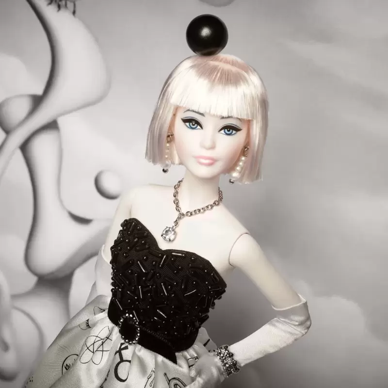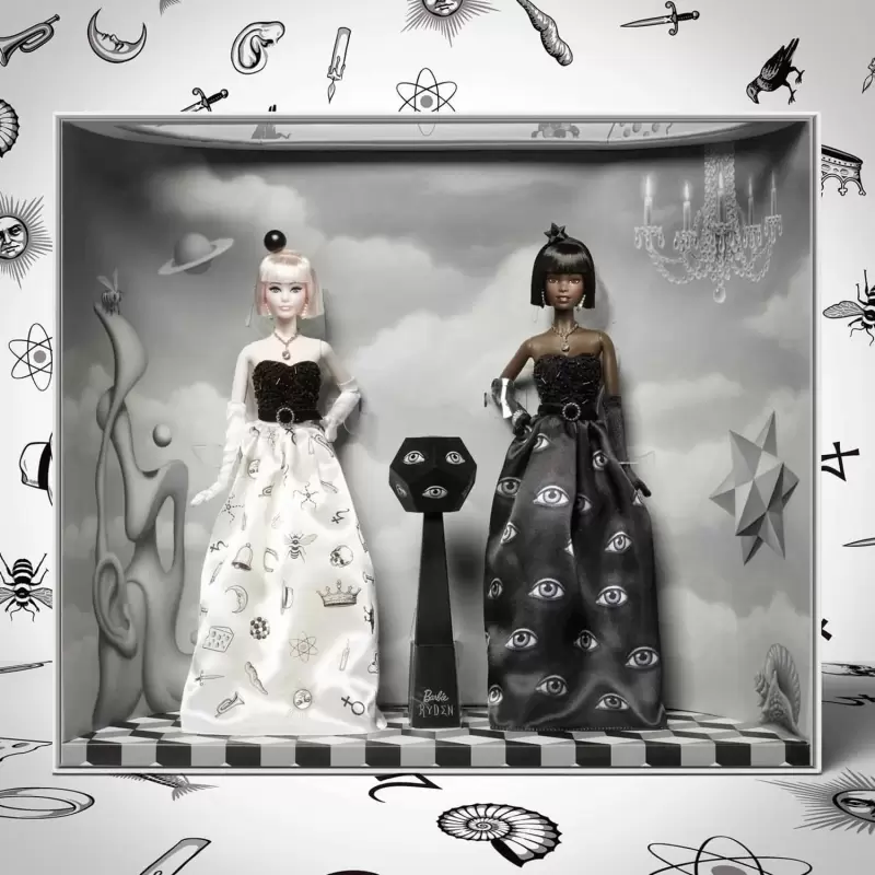 MARK RYDEN × 芭比娃娃聯名的「Barbie at the Surrealist Ball 超現實主義舞會芭比」,與黑/白雙色調、像是光與影一般的兩位芭比共舞吧~採用鮮明對比的黑白膚色雙芭比組合,皆為俐落的齊劉海、角度鮮明的短髮,身穿著設計有宇宙、生物與眼球等極具 Mark Ryden 風格圖樣的禮服,閃亮珠寶也十分搶眼,另附有特殊打造的十二面體。