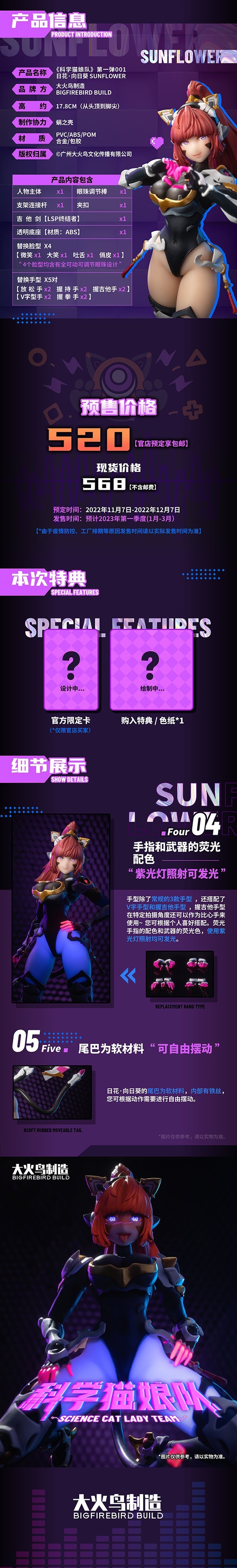 中國廣州的新興玩具品牌 大火鳥玩具(大火鸟制造 BIGFIREBIRD BUILD),由蝸之殼工作室協力製作,推出旗下原創的《科學貓娘隊》系列首彈「001 日花 向日葵SUNFLOWER」包膠可動人偶,參考售價為 568 人民幣,預計將於 2023 年第一季發售!
