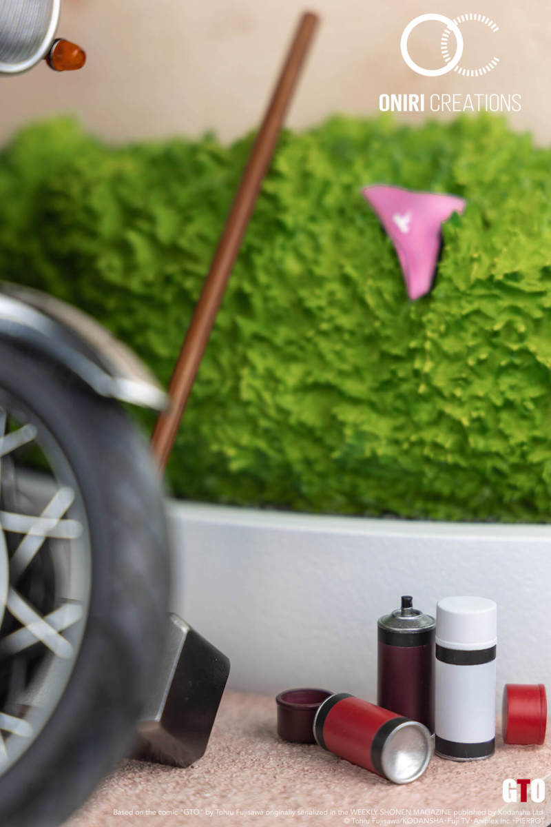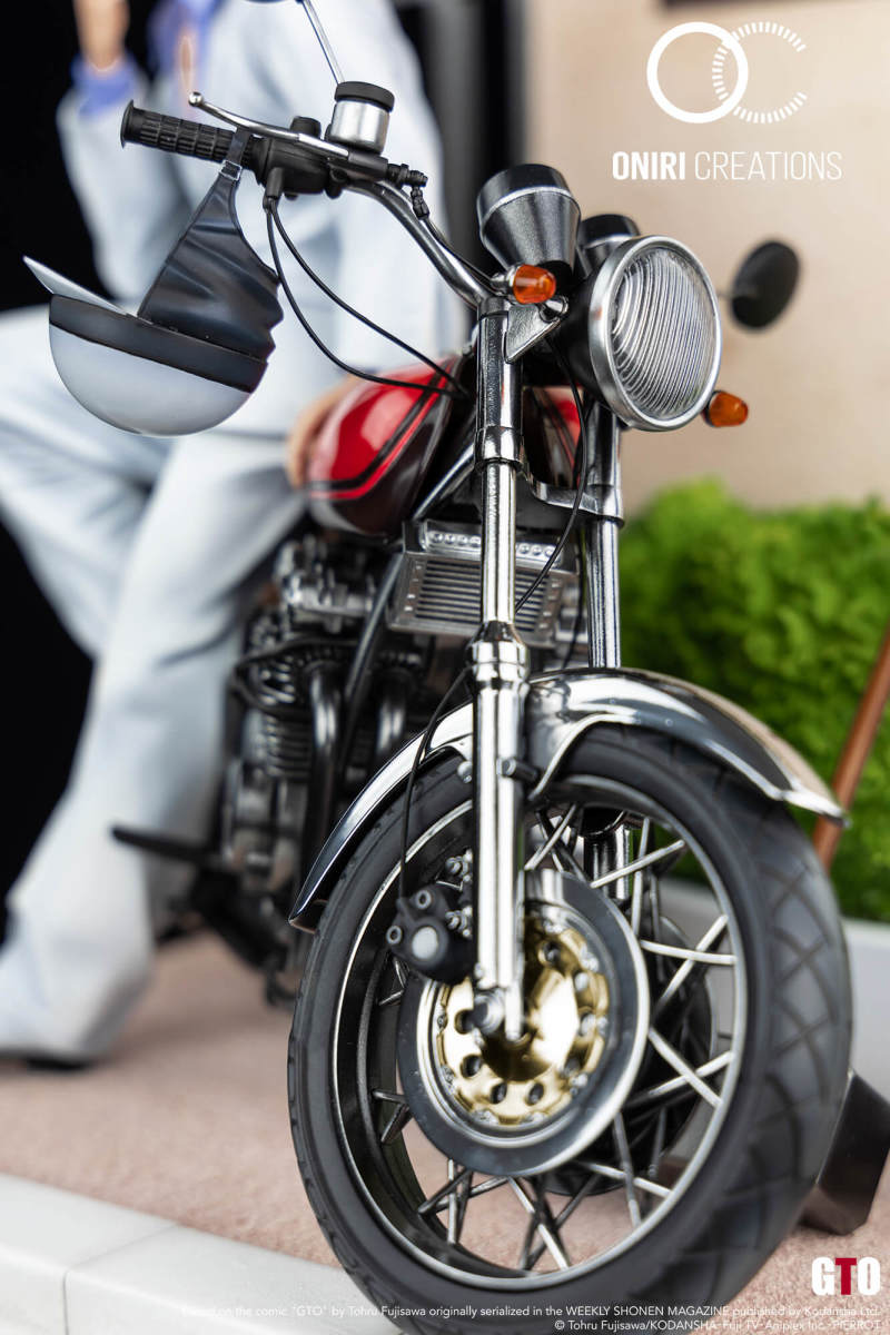 本作高約 33 公分,打造出「鬼塚」靠坐在自己心愛的 ZII 上頭抽菸的帥氣姿態,整體是以他決定當老師之後的造型為主題設計,再現了清爽的金色短髮、白色的成套西裝,服裝部分施以細緻的陰影塗裝,並可以利用替換零件再現三種表情與戴上墨鏡......等不同的姿態,那顆哭臉頭雕官圖看起來真的有醜喔!而在摩托車的機構細節、聖林學苑校門口的場景則有不錯的表現,還可以看到小褲褲、鐵鎚、噴漆罐,以及背面的 GTO 字樣!