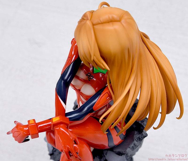 「GOOD SMILE COMPANY 明日香‧蘭格雷」 1/7 比例模型,將大人形象的明日香立體化,還原駕駛服被撐破的性感洞洞裝,光澤鮮豔的紅色駕駛服塗裝與裸露肌膚質感形成鮮明對比,展露出凹凸有致的身形,胸前的景色相當誘人!臉龐與氣質充滿成熟韻味,眼神明媚但又透出一絲悲傷與惆悵…,輕柔散開的長髮也精心打造。頭上原先標誌性的感應裝置,這次特別卸下於手中和散落身邊。