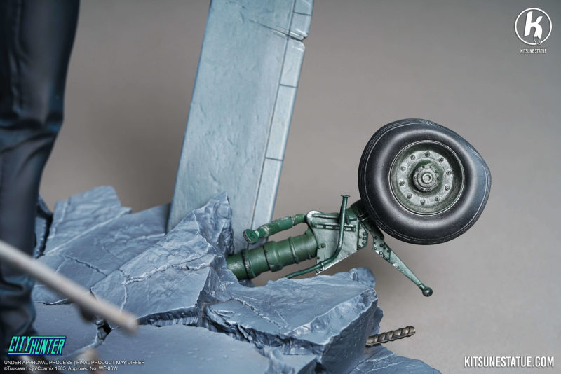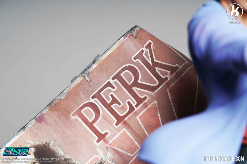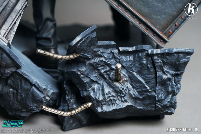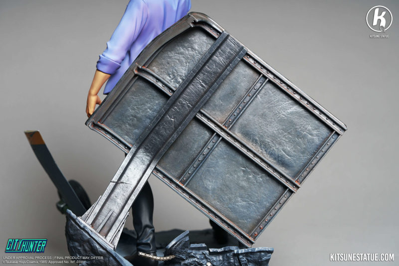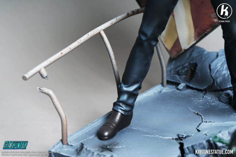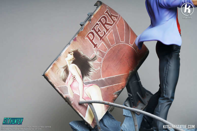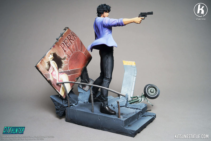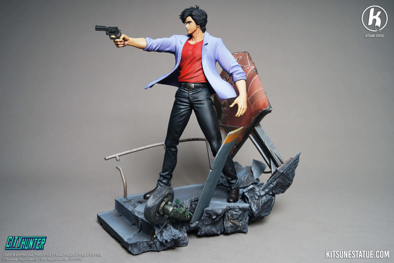 「Kitsune Statue 冴羽 獠」1/6比例雕像,尺寸全高約 36 公分,辣個身穿擔紫色外套、內搭紅色背心的男人,再次以經典樣貌回歸!還原帥氣的臉蛋和精壯的身材,手上的.357麥格農愛槍細節相當精細,手臂上的青筋與肌肉線條也逼真刻劃。底座充滿造成破獲與騷動的細節:例如被他射中的螺旋槳和直升機的輪子,背後還有漫畫中的性感美女福利廣告看板,營造出阿獠又帥又色的個性!另外,附有漫畫/動畫兩種不同版本的替換頭雕。