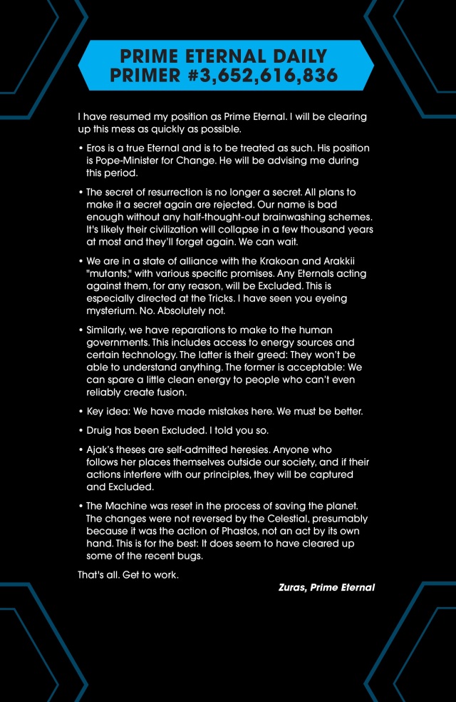 幾件事情也在重新成為永恆族至尊的祖拉斯(Zuras)的報告中被確認了。首先是「星狐(Starfox)」厄洛斯(Eros)的身分——他被認證為真正的永恆族,即使他並非原初的那一百人;人類對於永恆族的仇恨過個幾千年大概就會被忘掉了,他們可以等。