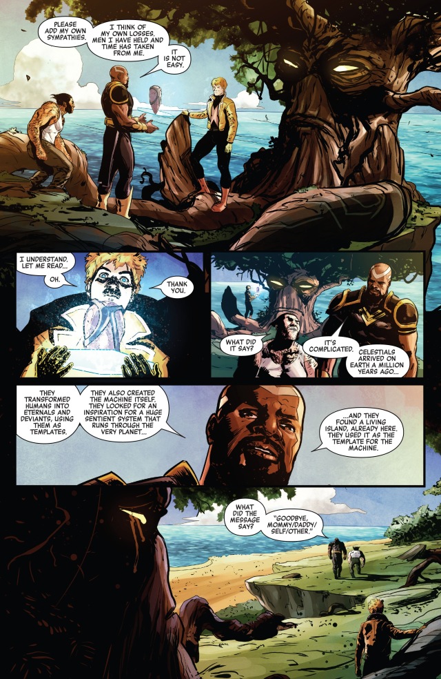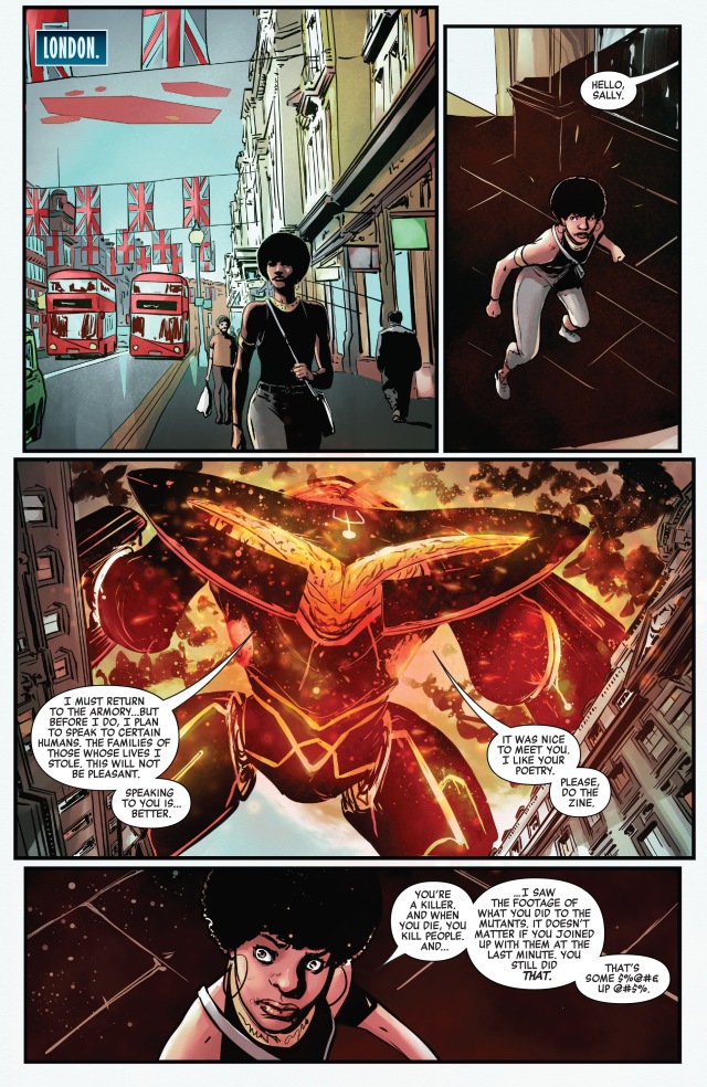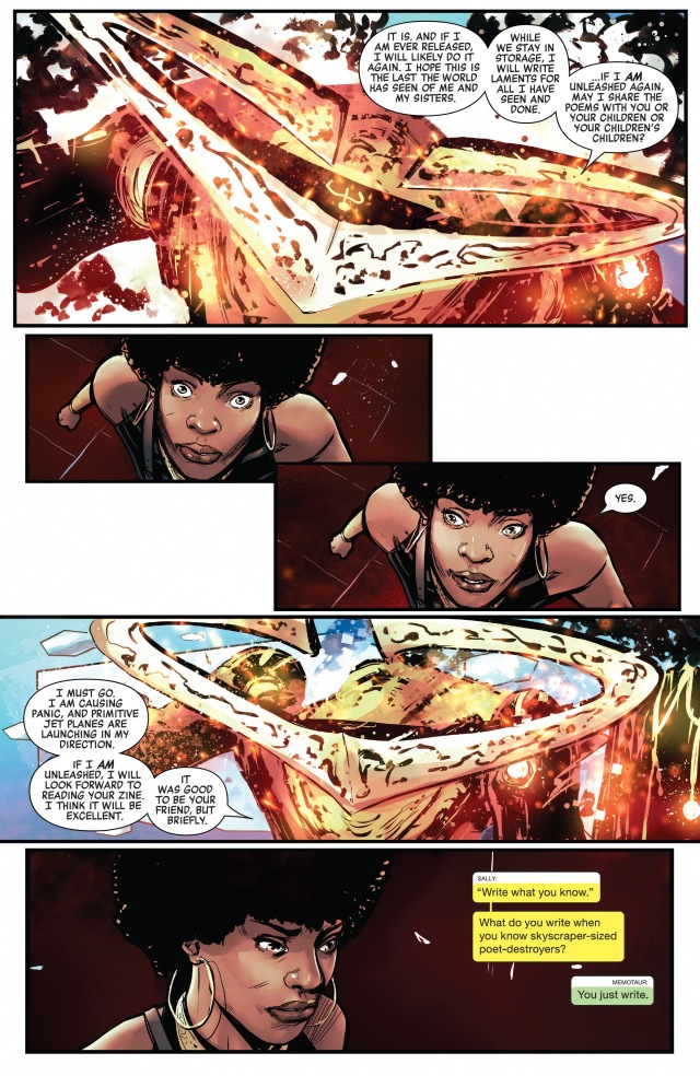 而另一位與永恆族有密切交流的女子,試著寫詩的Sally——則是終於遇上了在故事中一邊試著摧毀克拉科(Krakoa),一邊在與她用簡訊交流的The Hex成員Syne the Memotaur。