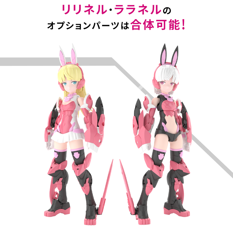 BANDAI SPIRTIS 也將於 12 月推出她的姐妹機「30MS SIS-T00 萊萊涅爾[顏色B]」,她的武裝為腿部彷彿兔子的腳掌以及兩側兔耳般尖尖的可動刀刃,兩人的武裝能裝備到彼此的身上,合體成完整的全套裝備!