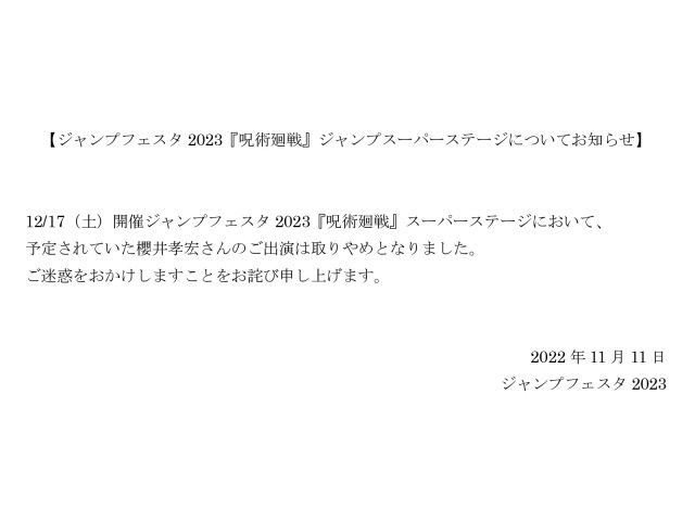 才剛宣布《咒術迴戰》活動聲優名單的集英社「2023 JUMP FESTA」,在日前於Twitter上正式宣布,擔任「夏油傑」的一線聲優櫻井孝宏,確認取消演出,不再參與預定在12月17日舉辦的活動節目。