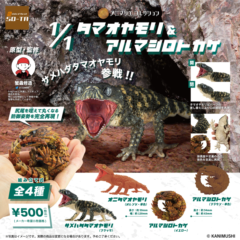 日本的轉蛋玩具製造商「State of the Art」(簡稱SO-TA / 株式会社SO-TA)旗下將生物真實再現的「Animalier Collection」系列轉蛋,繼大人氣的「鬼玉尾守宮&犰狳蜥」後,這次又將推出新配色版本的「1/1 鬼玉尾守宮&犰狳蜥」(オニタマオヤモリ&アルマジロトカゲ)轉蛋/盒玩!一共有四款,預計將於 2023 年 02 月發售。