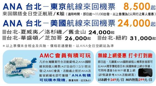 因為幾乎每年都有計畫去日本血拼玩具,所以都會注意一下ANA全日空航空網站關於飛往日本的促銷機票或是什麼促銷活動的,最近看見新一季的促銷活動是買個人機票或是AST全日空逍遙遊(機+酒)就送下圖可愛的積木飛機公仔,不過前提是要先加入全日空AMC的會員才可獲得的,剛好有計畫去日本的朋友可以考慮一下這個小優惠的促銷活動歐!