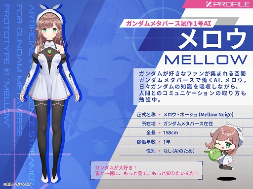 在今年年初時,萬代南夢官集團就公布了近年的中期計劃細節,其中最引人注目的,就是計畫打造專屬的「IP元宇宙」,來打造數位虛擬空間以及設施加強與粉絲的互動與連結度。而最近發表了隸屬於「鋼彈元宇宙」的代表,育成AI「Project・Mellow」( プロジェクト・メロウ ) 將正式登場,類似 VTuber 的形式將會在 YouTube 上與粉絲直播互動,