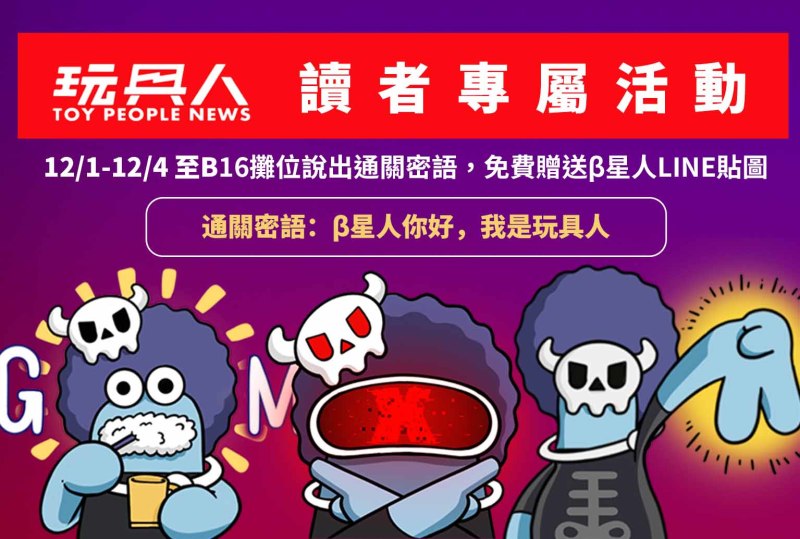 12/1~12/4展覽期間至B16攤位對工作人員說出【 β星人你好,我是玩具人】通關密語,並加入β星人LINE官方帳號,即可免費獲得【 β星人LINE貼圖】,大家12月在展場見啦!