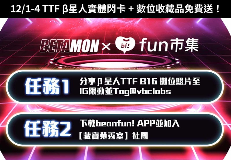 歡慶β星人即將進駐《fun市集》,至B16攤位完成指定任務,即可獲得【 β星人實體閃卡+beanfun! β星人數位收藏品】,讓你炫好炫滿!成功領取「數位收藏品」還可以參加抽獎唷!!!