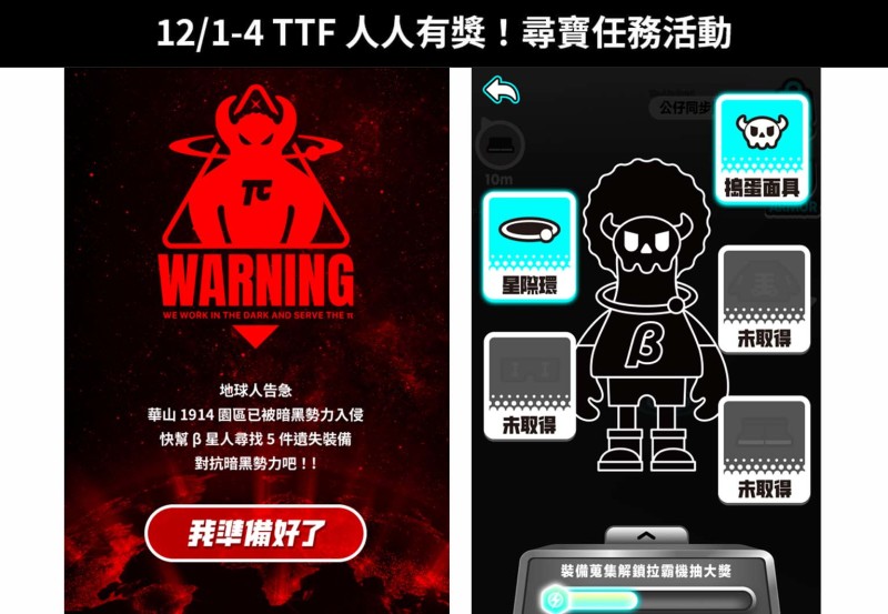 暗黑力量來襲!需要靠各位地球人搜尋散落在TTF展覽五件裝備讓β星人能對抗暗黑力量,完成任務即可抽全球限量【β星人公仔】、3折券、 β星人貼圖等多項好禮,千萬別錯過!