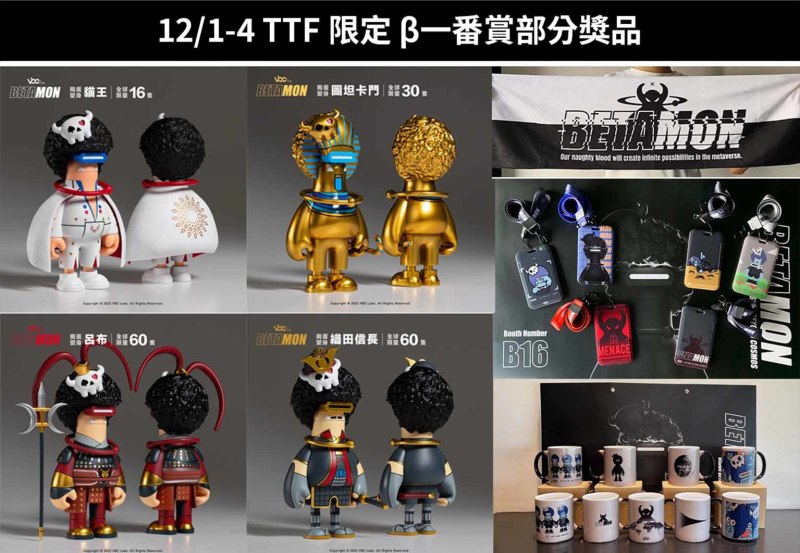 經典一番賞活動,一抽入手【β星人名人系列】公仔《貓王》、《圖坦卡門》、《織田信長》 、《亞瑟王》 、《呂布》 、《凱薩大帝》….等多款全宇宙限量造型公仔,更有VBC labs精心設計的【β星人TTF展覽限定週邊商品】