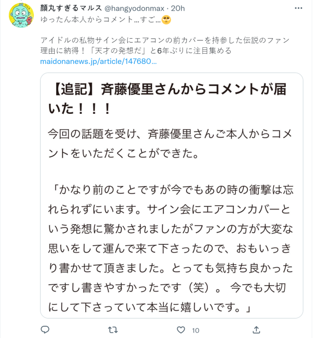 還獲得了本人的回應 ... ! 當時優里本人看到都很驚訝,到現在都記憶猶新,只能說這個做法真的很厲害 XD。