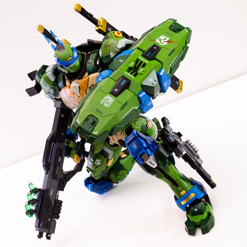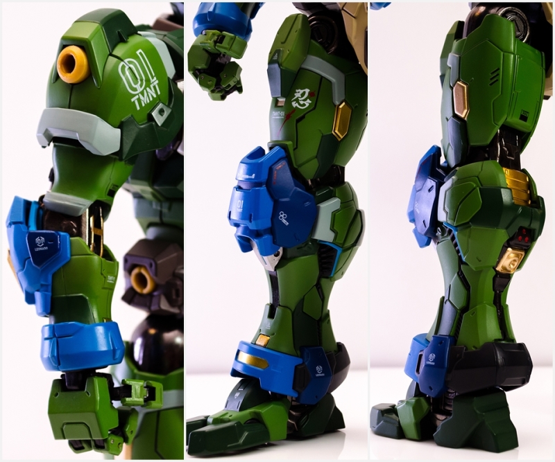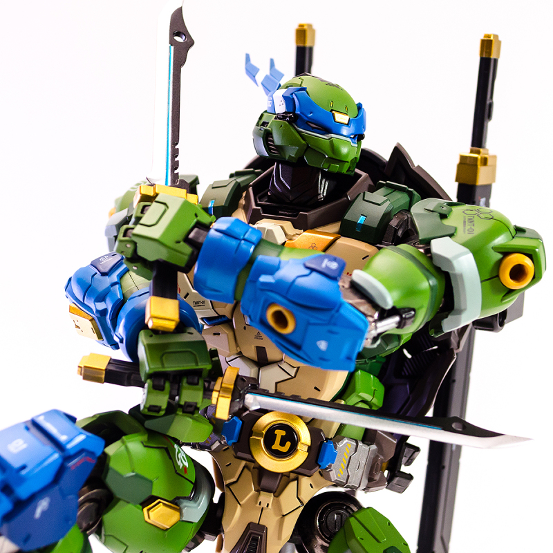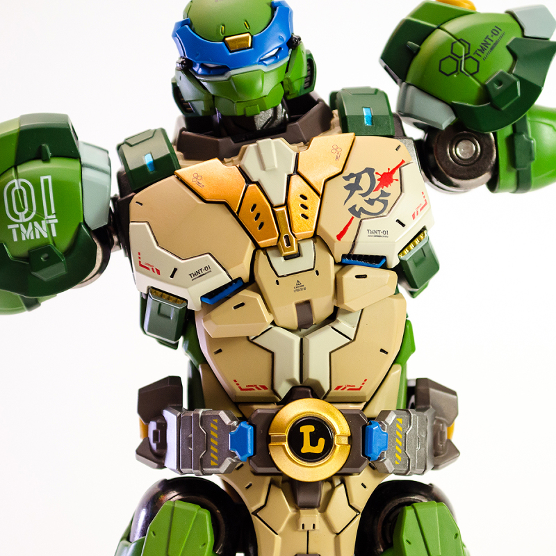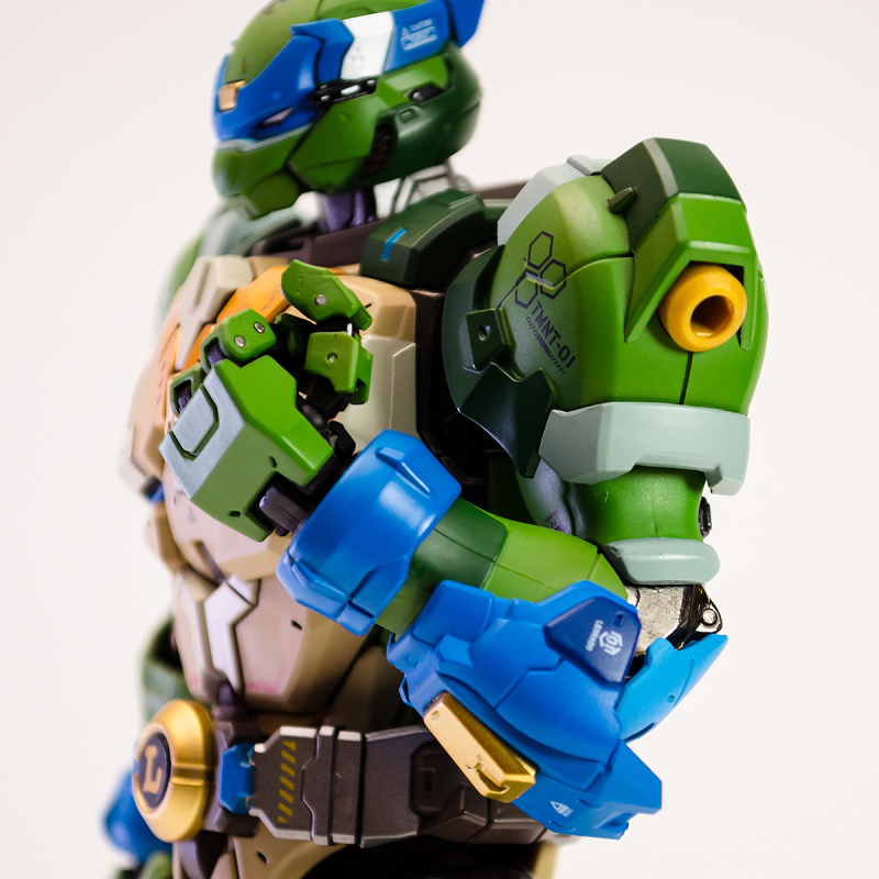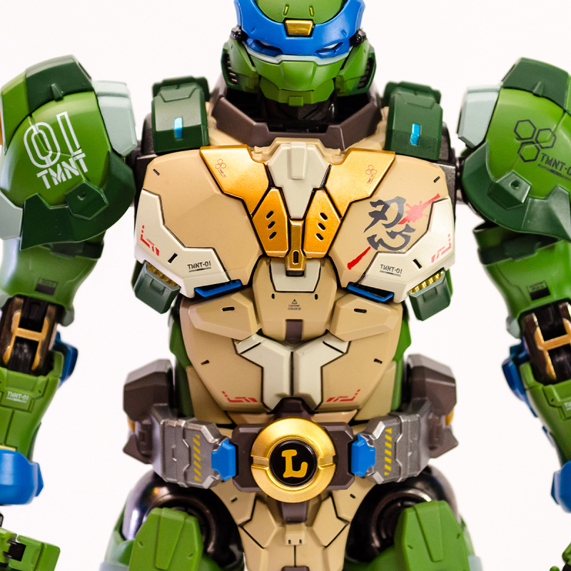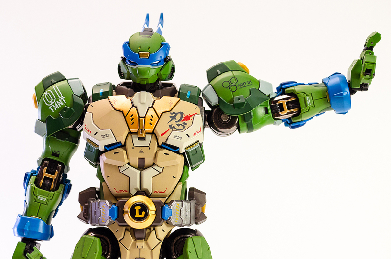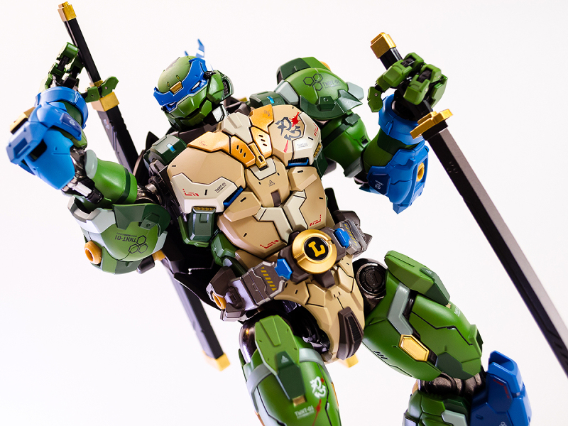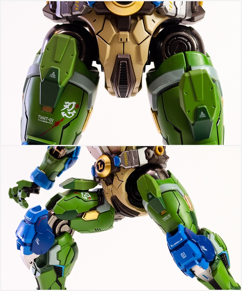 ▼ 整體造型基於綁著藍色眼罩的李奧納多重新設計,加入非常多充滿既視感的現代機器人的主流元素,各處都有精密的裝甲分割與跳色塗裝設計,表現出充滿肌肉般壯碩的體態以及龜殼的層次與厚重感。