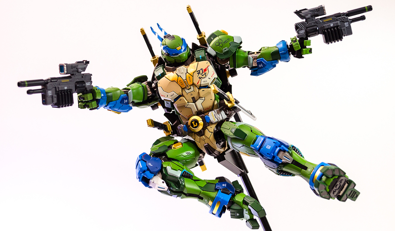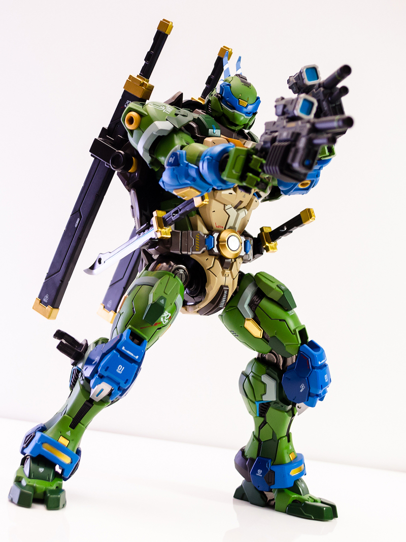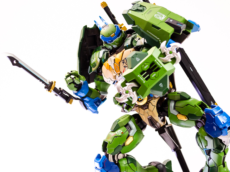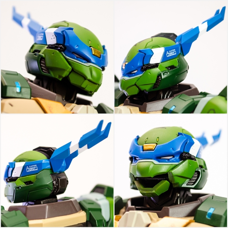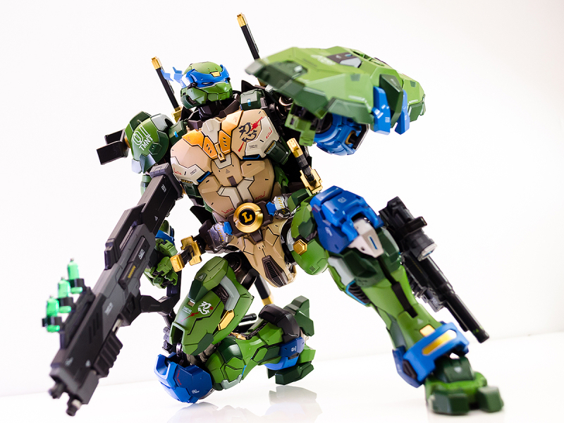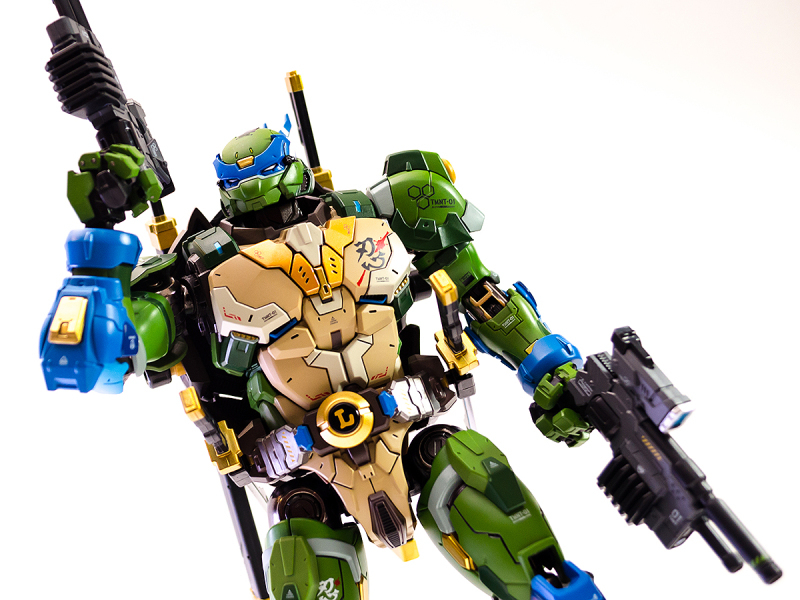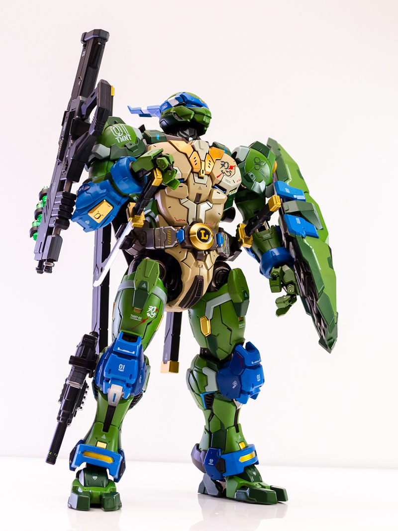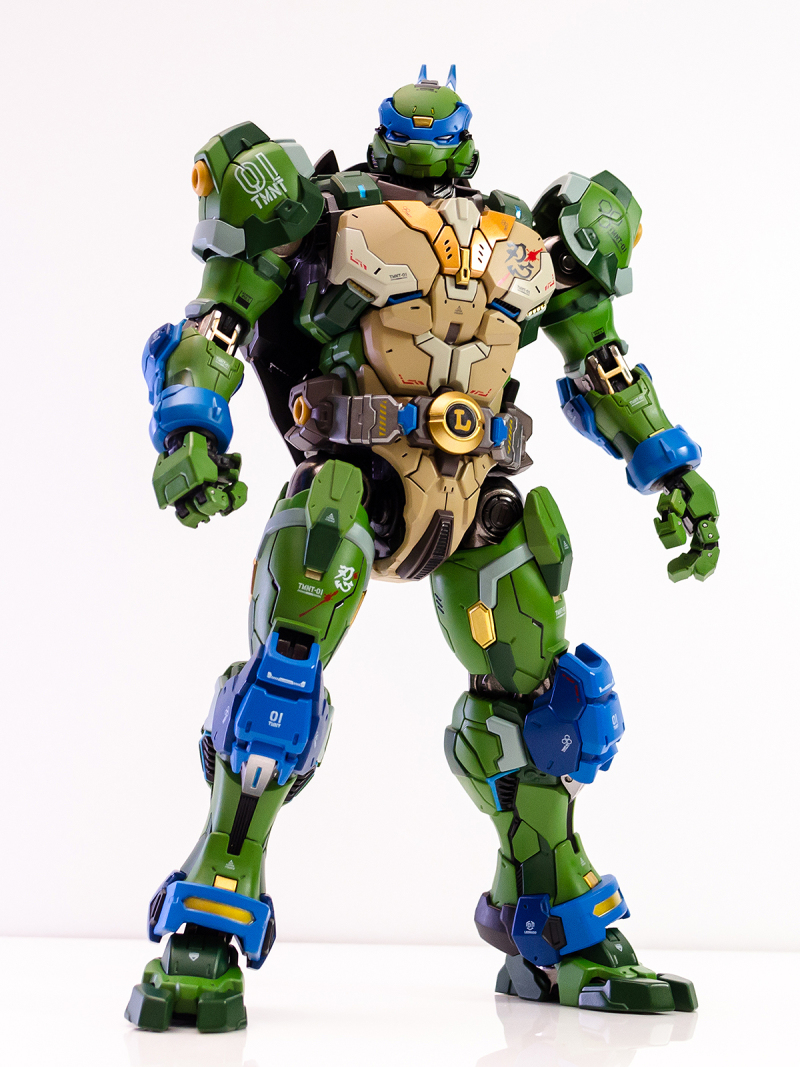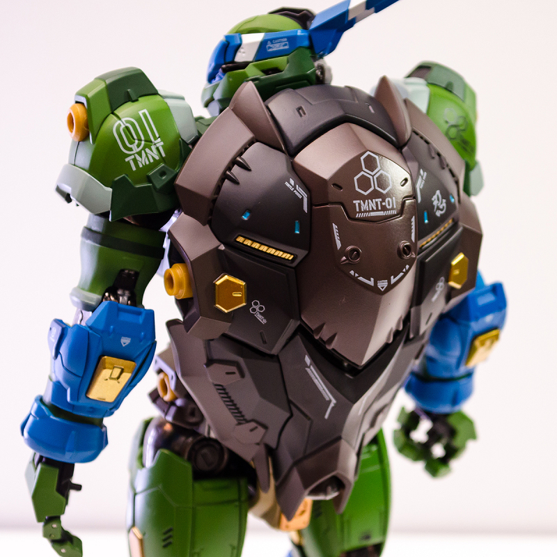 ▼ 整體造型基於綁著藍色眼罩的李奧納多重新設計,加入非常多充滿既視感的現代機器人的主流元素,各處都有精密的裝甲分割與跳色塗裝設計,表現出充滿肌肉般壯碩的體態以及龜殼的層次與厚重感。