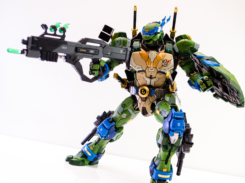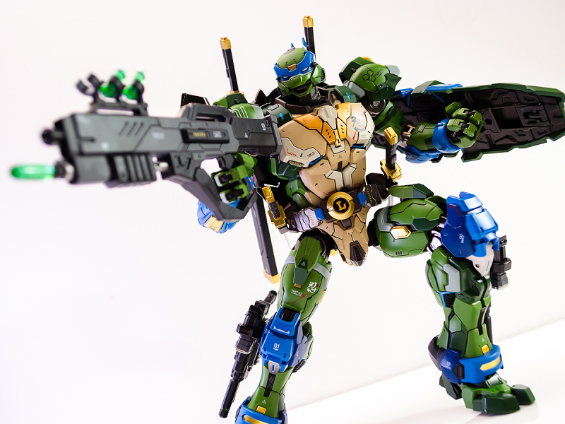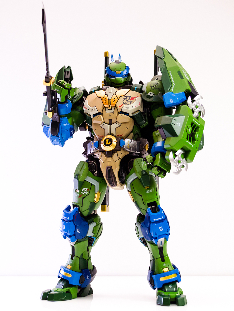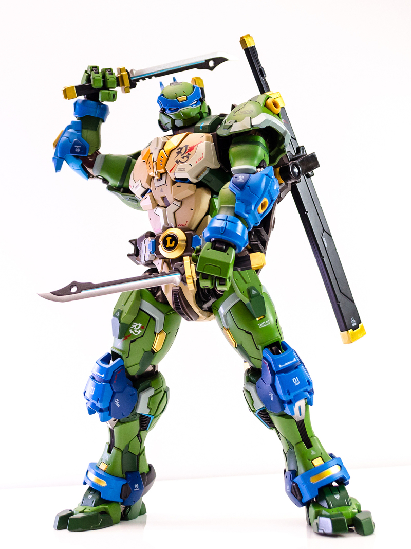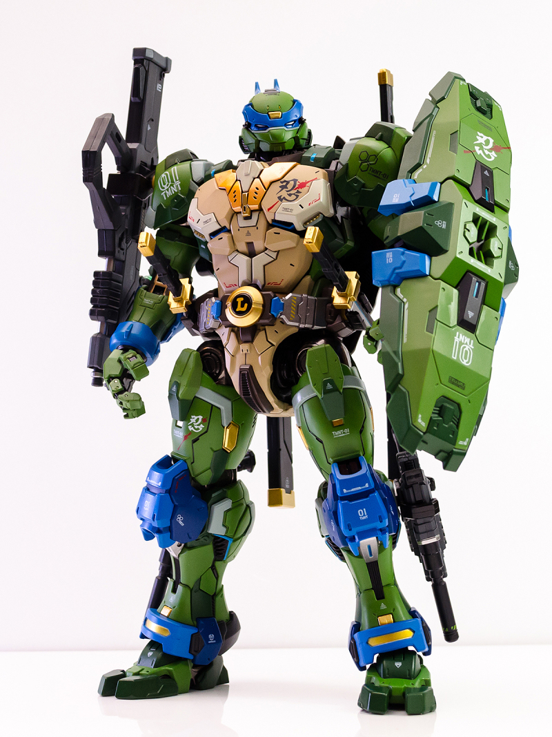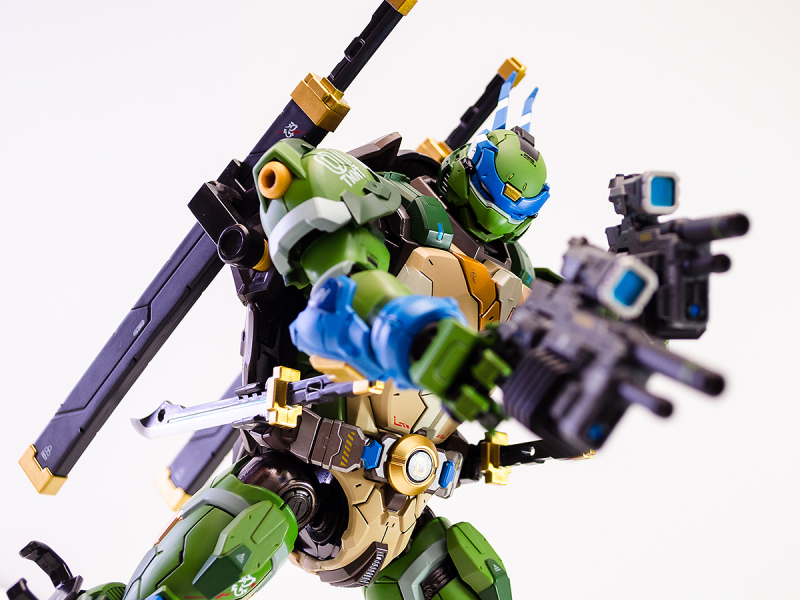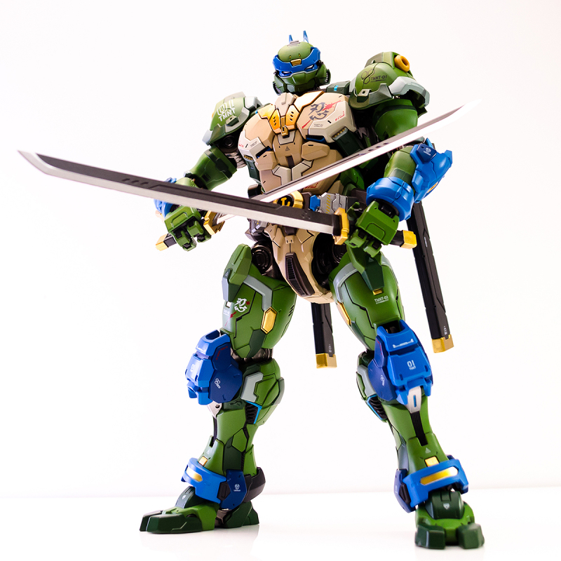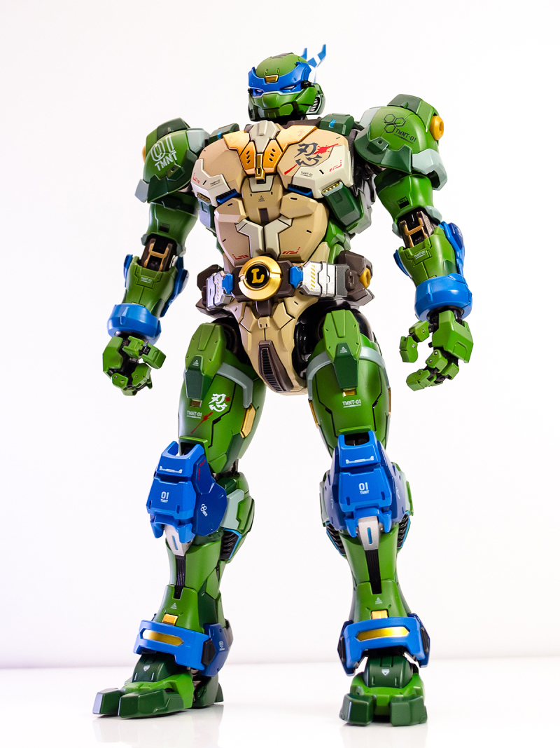 ▼ 整體造型基於綁著藍色眼罩的李奧納多重新設計,加入非常多充滿既視感的現代機器人的主流元素,各處都有精密的裝甲分割與跳色塗裝設計,表現出充滿肌肉般壯碩的體態以及龜殼的層次與厚重感。