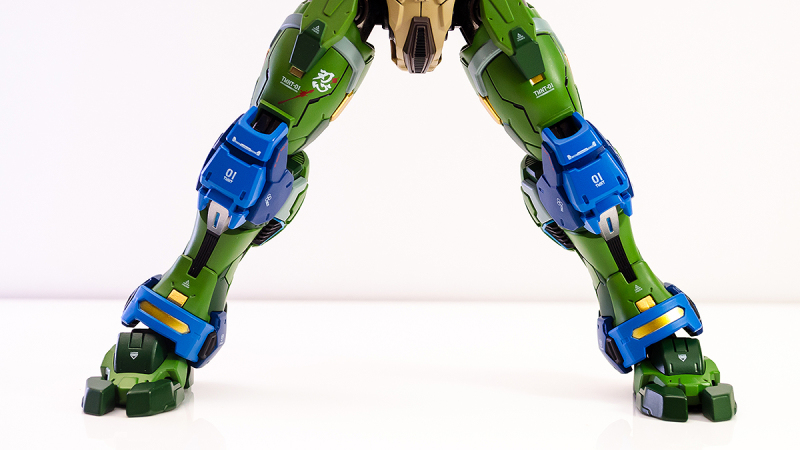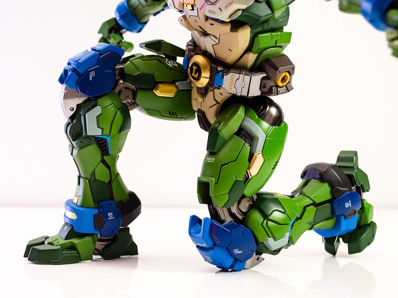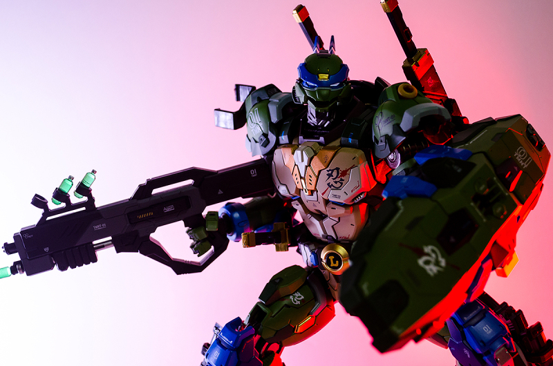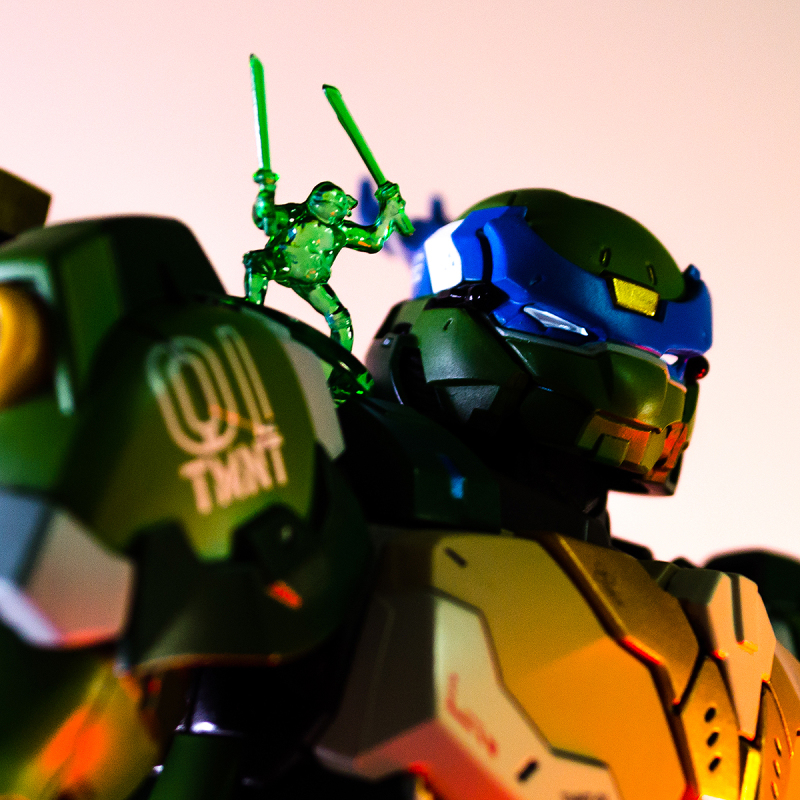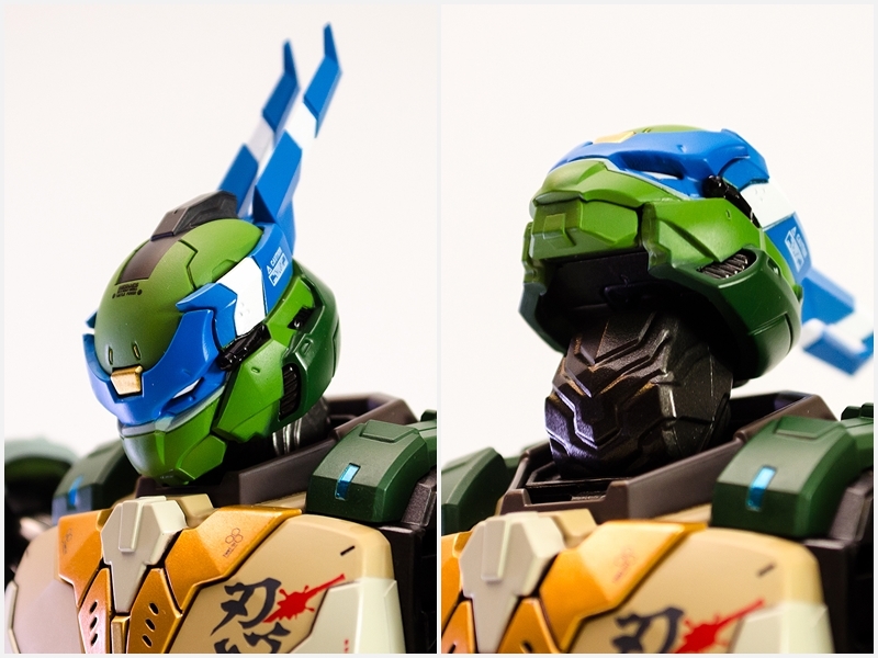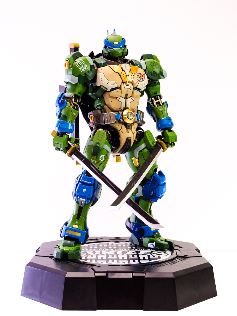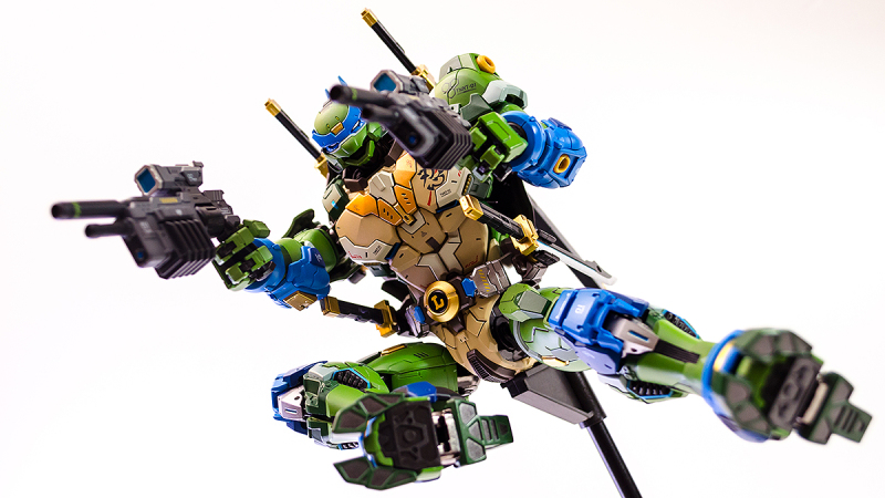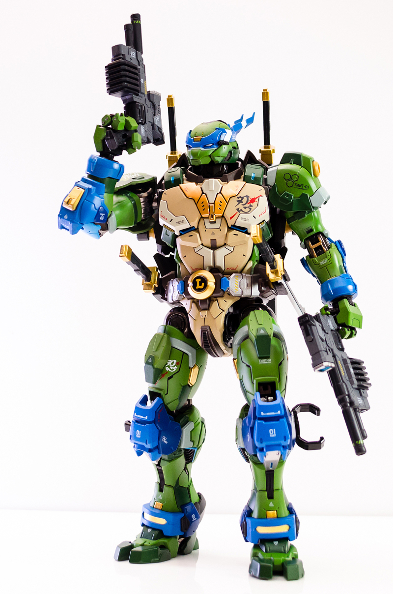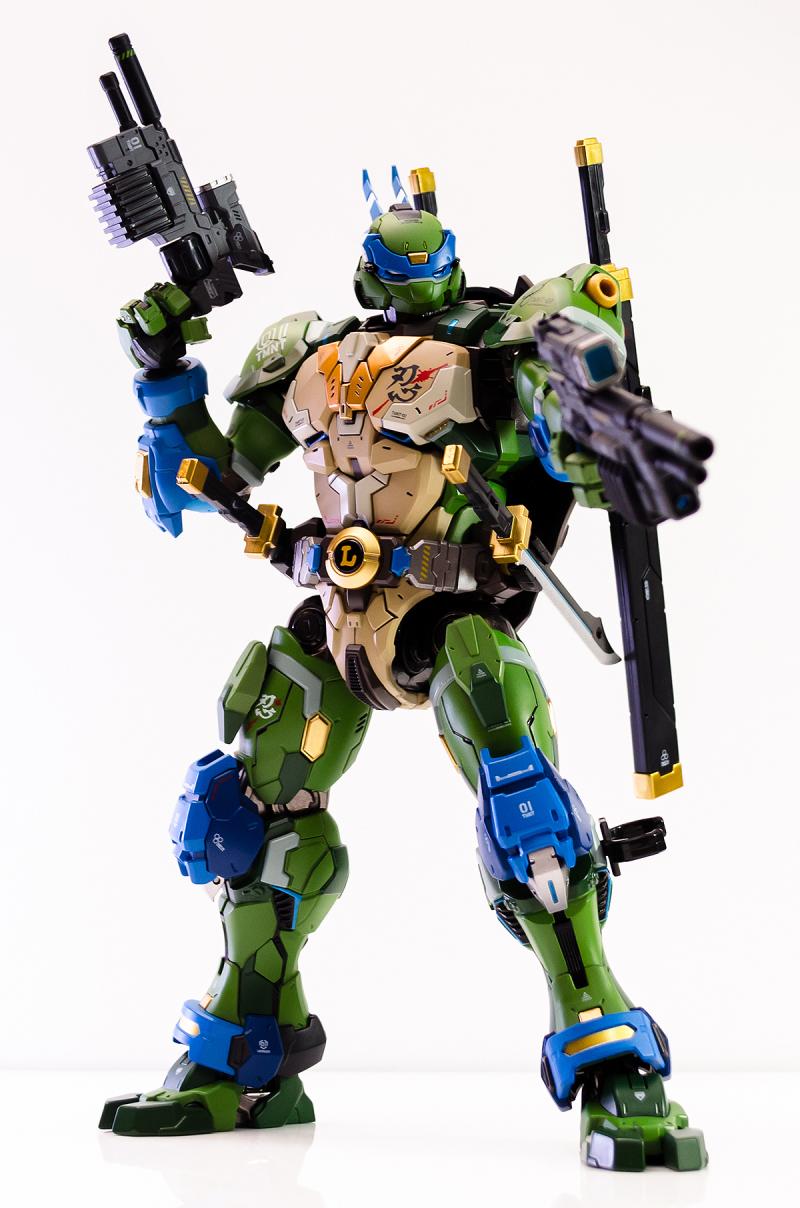 ▼ 整體造型基於綁著藍色眼罩的李奧納多重新設計,加入非常多充滿既視感的現代機器人的主流元素,各處都有精密的裝甲分割與跳色塗裝設計,表現出充滿肌肉般壯碩的體態以及龜殼的層次與厚重感。
