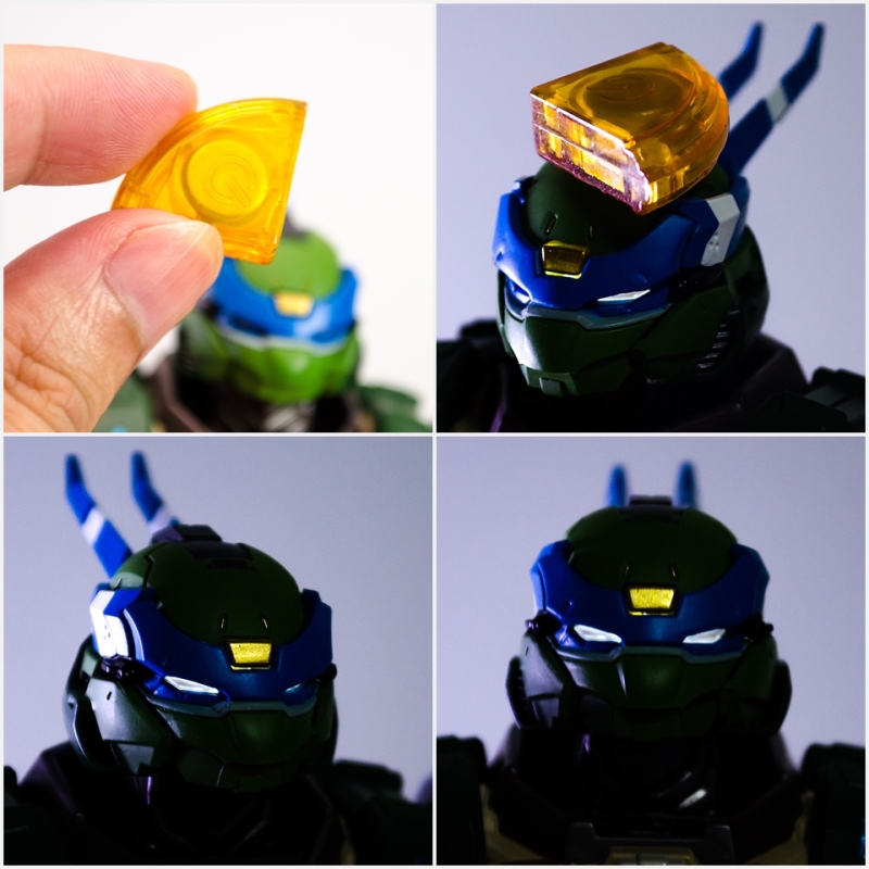 ▼ 此外頭部還內藏點亮雙眼的 LED 燈發光裝置,不過點燈方式還滿有創意的,採用忍者龜最愛的美食「披薩」作為磁吸式開關的造型,只要輕輕觸碰眼睛週遭可以點亮雙眼。