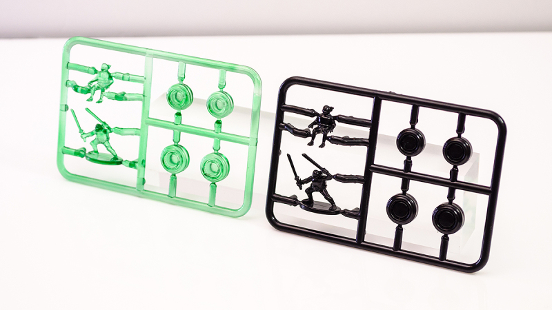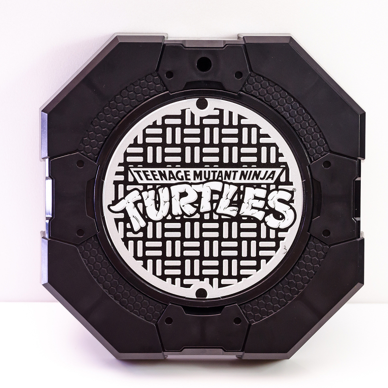 ▼ 配件中還有一組專用台座與可動支架,採用經典的《忍者龜》LOGO 字樣與下水道人孔蓋形象進行設計,不過可惜的是 LOGO 以外的部分並沒有進行塗裝,呈現塑膠原本的色澤。
