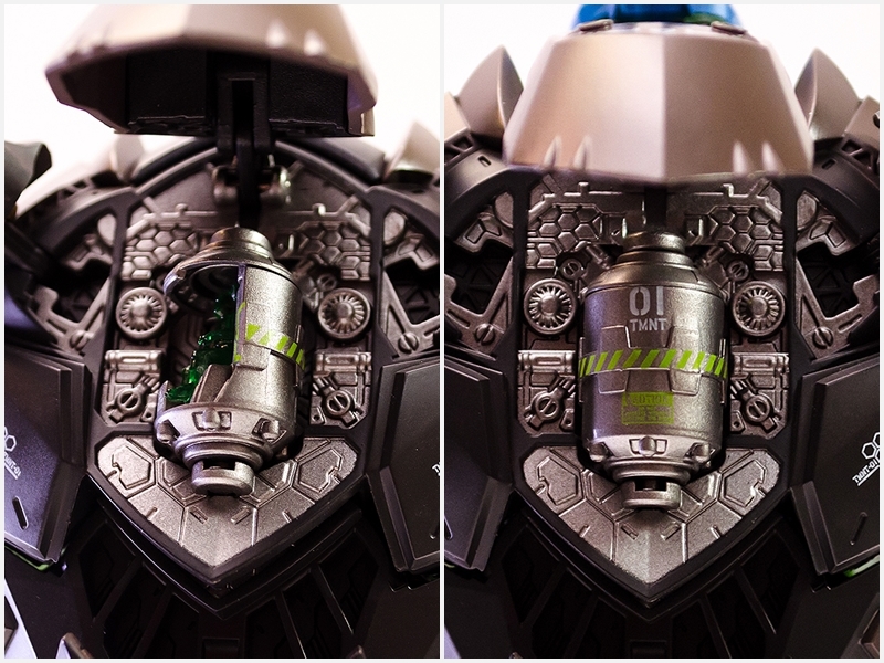 ▼ 那麼駕駛艙在哪裡呢?一般都是在胸口吧?但機甲忍者龜可是設計在最堅固的龜殼裡面,打開龜殼就能發現裡面的罐狀駕駛艙。