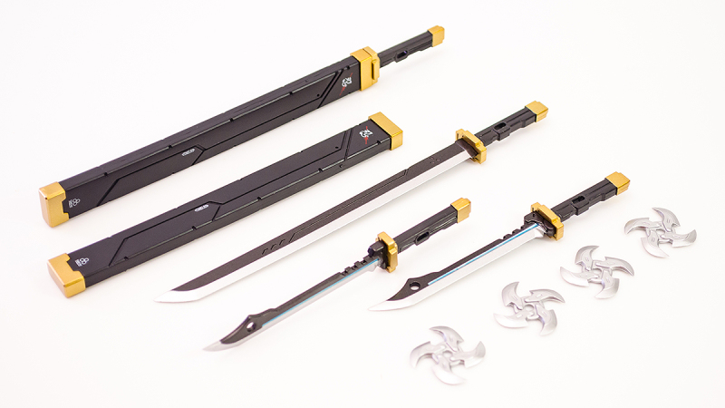 ▼ 以上就是本體大概的機構介紹,接下來看看有哪些帥氣的武器吧!配件中附有兩把含刀鞘的武士刀、較短的是兩把匕首、忍者飛鏢就是所謂的手裡劍也附上 4 個,都具被金屬色塗裝以及細部的標誌印刷。