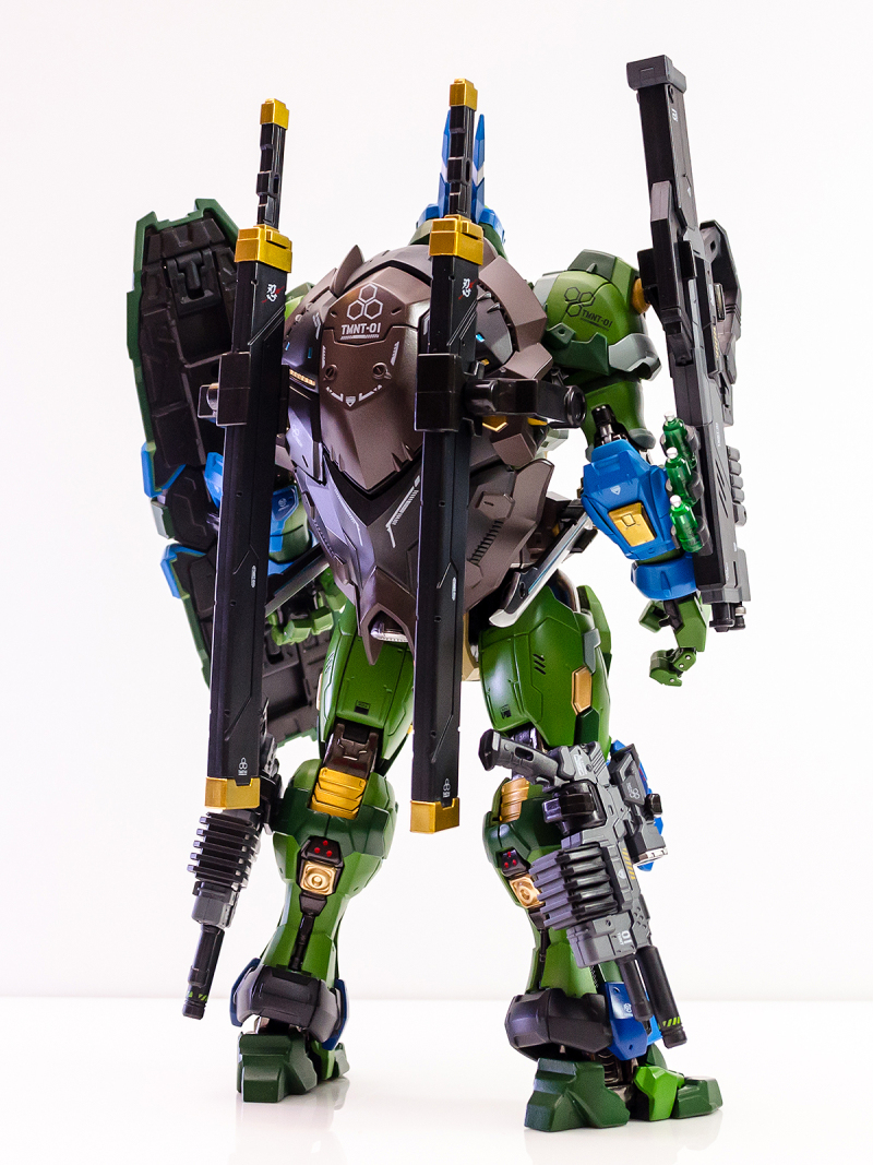 ▼ 背部這邊先不裝上龜殼背包,避免一些細節被擋住。可以看見各部合金關節都呈現厚重金屬色澤。全機也印刷了機體編號「TMNT 01」、稍嫌中二的「忍」字等多種機身標誌來充實裝甲表現的細節豐富度。