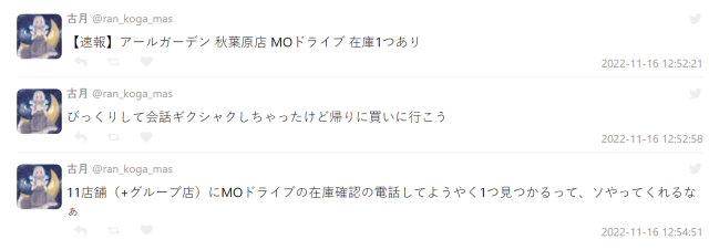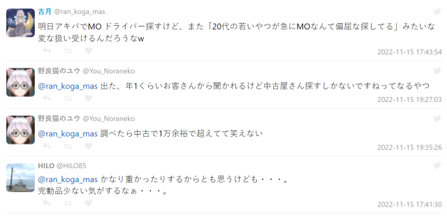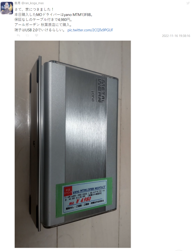 推主因為沒有可用的器材能夠讀取 MO 盤,尋求網友協助後決定去秋葉原電器行找方法,自己也嘲諷說 : 「怎會有 20 多歲的年輕人急著要找 MO 盤相關的資訊。」,網友也表示要找到可能都是中古品,是否可用也會有顧慮。