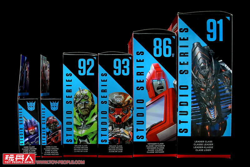 ▼本篇開箱的主角們,包括了兩款核心級(Core Class)、兩款豪華戰將(Deluxe Class)、一款巡弋戰將(Voyager Class),以及一款無敵戰將(Leader Class),從外盒大小就能夠輕易辨識出各級別的尺寸差異。