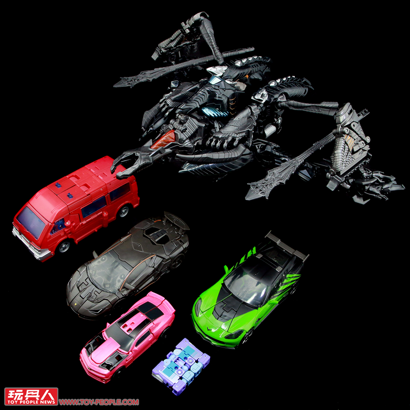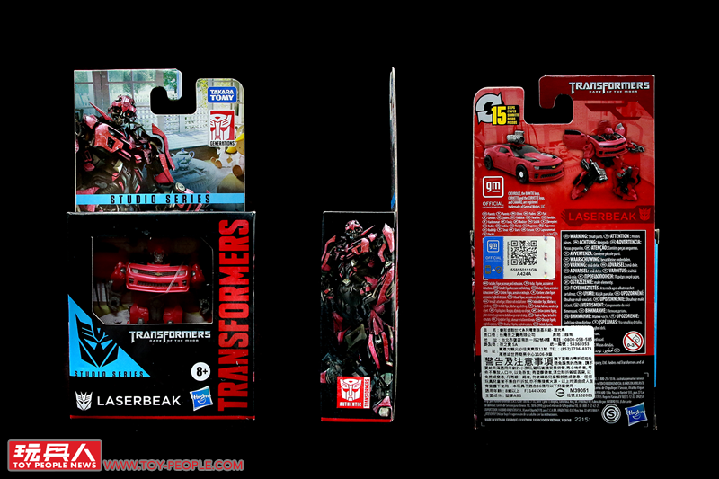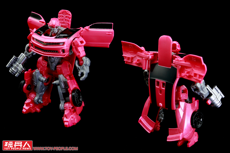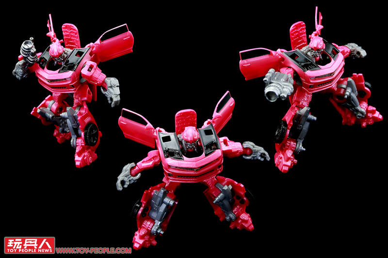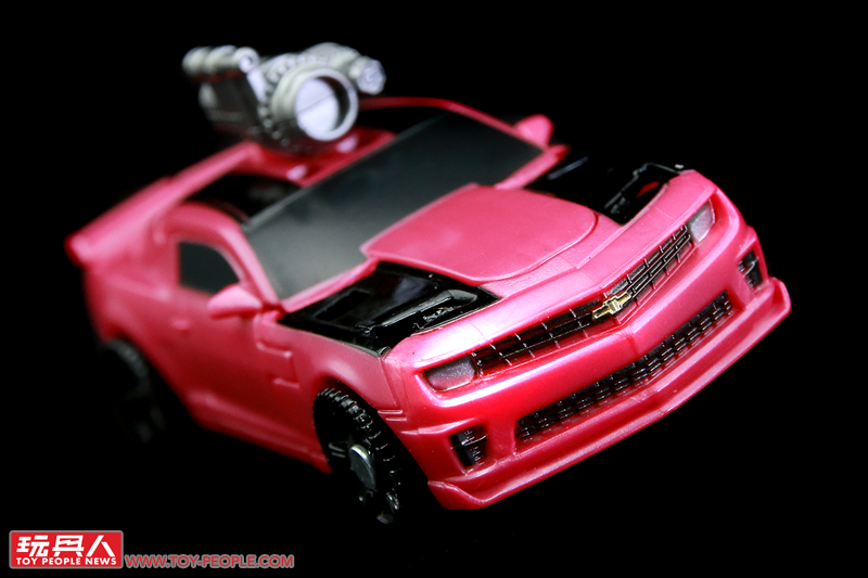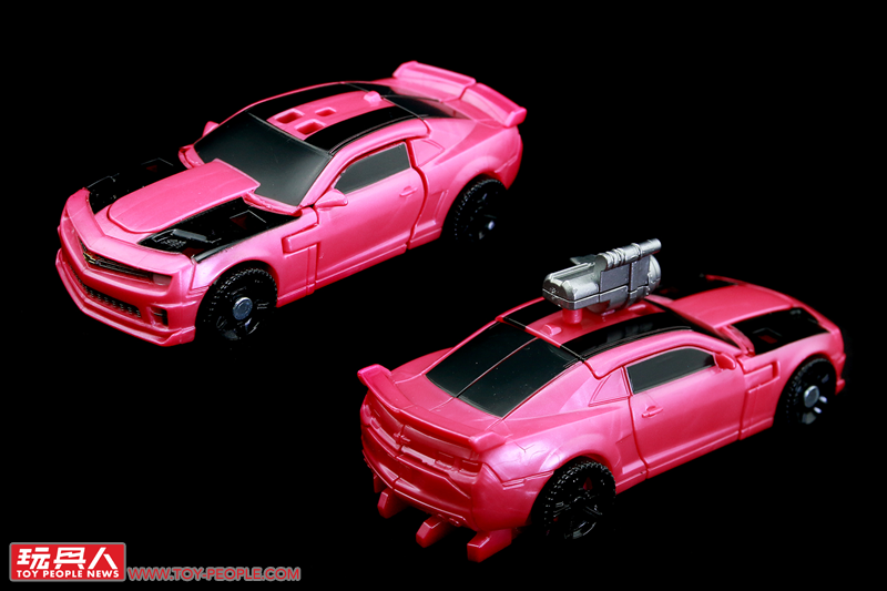 ▼「雷射鷹」(Laserbeak),源自2011年真人電影《變形金剛3》(Transformers: Dark of the Moon)中,由狂派(Decepticons)間諜偽裝成粉紅色大黃蜂(Bumblebee)的模樣。玩具實體為全新開模的核心級大黃蜂模組,以迷你的尺寸重現了雪佛蘭科邁羅(Chevrolet Camaro)的車型,同時附屬了招牌的「螫刺之銃」(Stinger Blaster),並採用了電影中一眼就能辨識出是偽物(?)的粉紅配色。