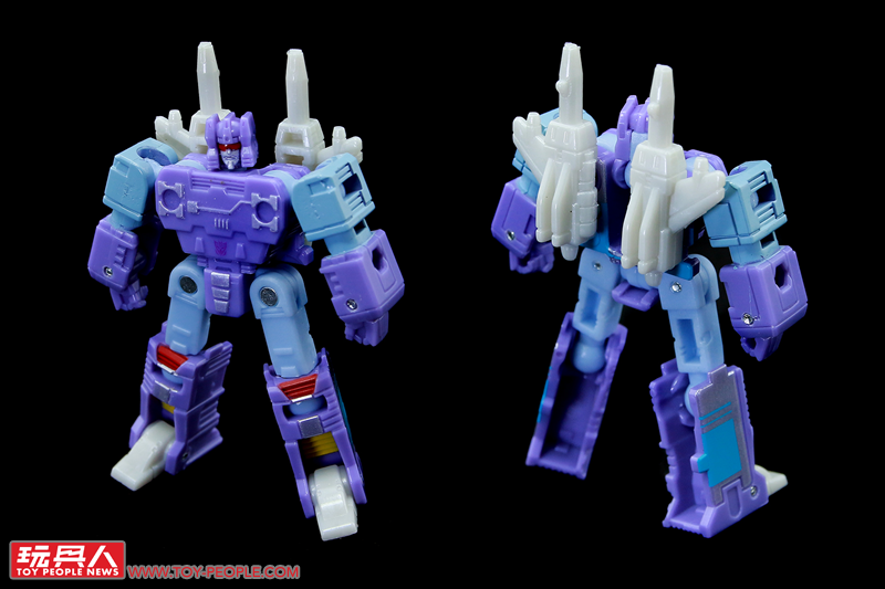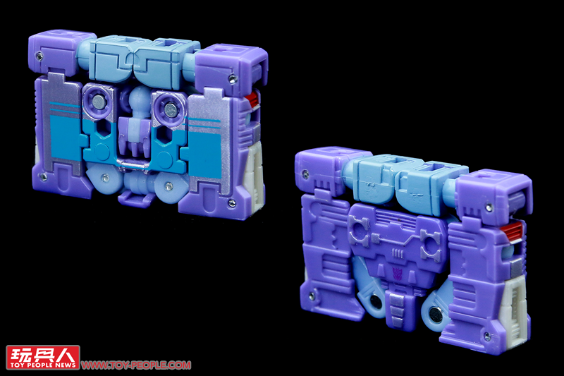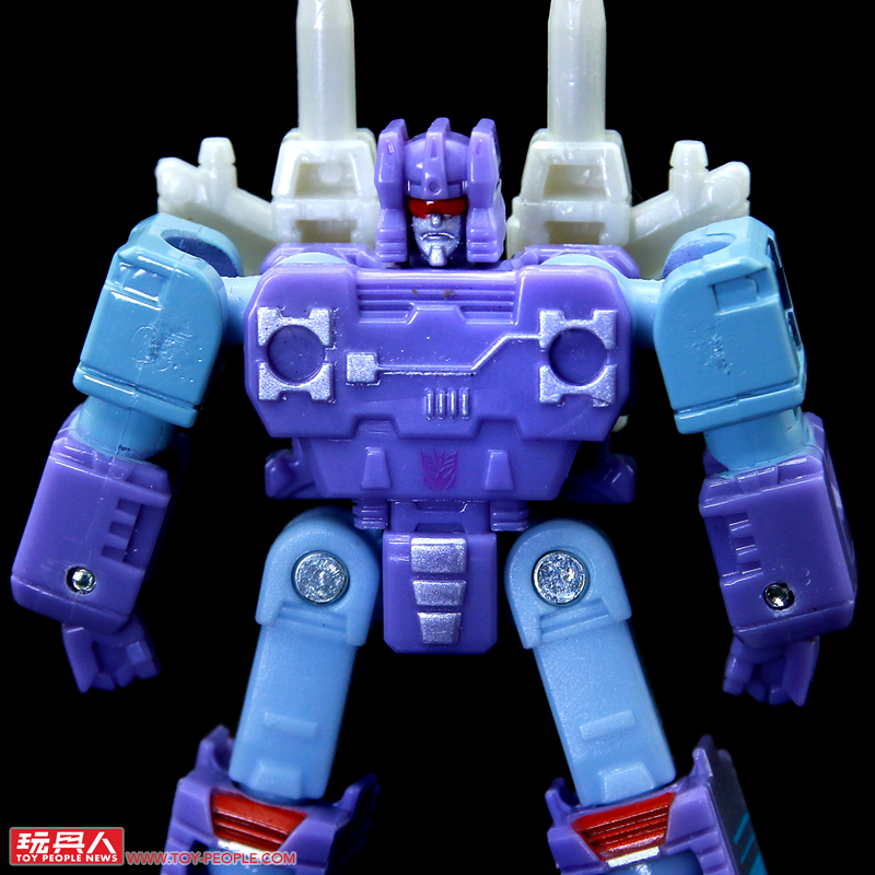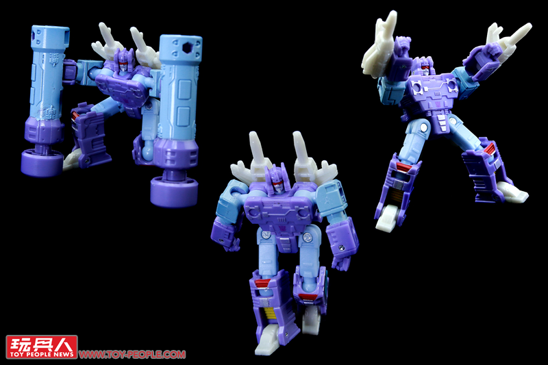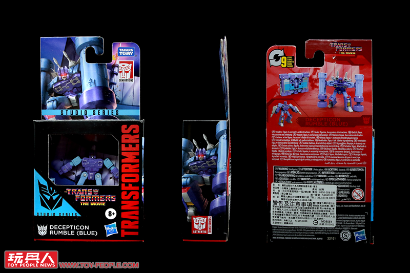 ▼「雷響(藍色)」(Rumble(Blue),或譯作轟隆隆),取材自1986年《變形金剛大電影》,隸屬於音波(Soundwave)的狂派卡帶金剛成員,可從迷你卡帶變形為機器人,並裝備上附屬的打樁機和沖壓步槍,卡帶模式的尺寸也能夠和塞博坦三部曲(War For Cybertron Trilogy)的音波和爆破者(Blaster)相容並收納在其胸口卡匣。值得一提的是,本次的配色採用了動畫中的藍色而非玩具的紅色,也就是國外粉絲常提(ㄔㄠˇ)及(ㄐㄧㄚˋ)的「FIRRIB 」(Frenzy is red, Rumble is blue/迷亂是紅色,雷響是藍色)。