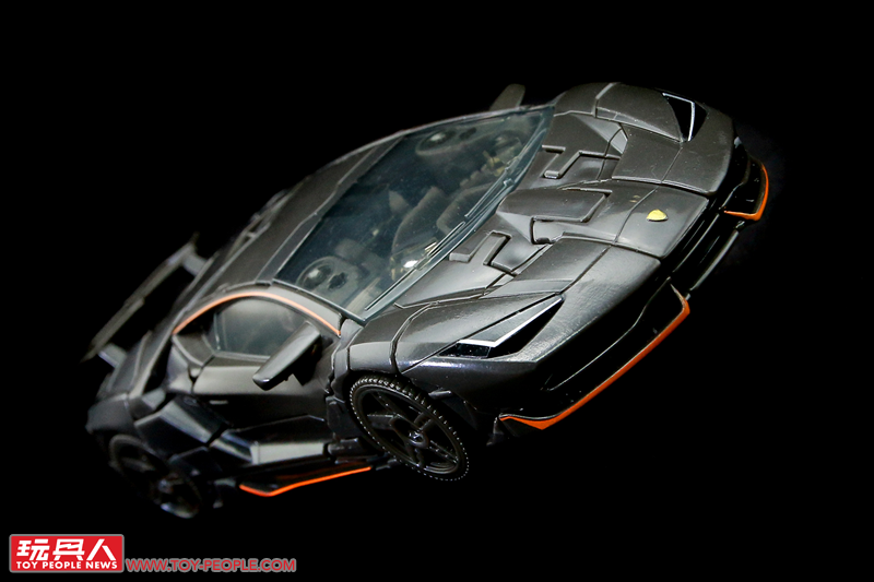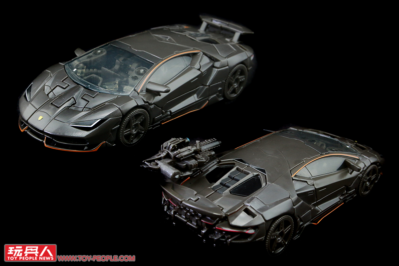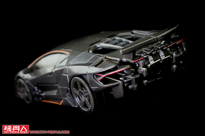▼載具超跑模式,這次的Centenario車型更加犀利也更為貼近真實的外型,鐵灰色的車殼和點綴的橘色線條都十分地還原。時間遲緩槍無法隱藏收納稍嫌可惜,只能裝在後輪上方的車殼卡榫。