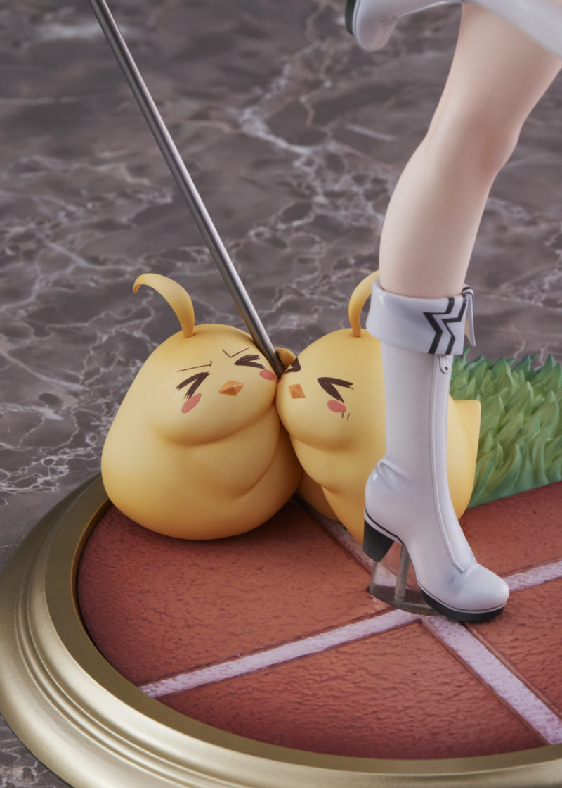 「GOLDENHEAD 里諾 波濤的啦啦隊長! 」1/6比例模型,尺寸全高約 31 公分,將遊戲中[波濤的啦啦隊長]造型立繪實體化,漂亮的透明銀白髮加上可愛笑容~身穿性感的啦啦隊服露出青春的肉體線條,手中高舉著金色塗裝的啦啦隊彩球,展露迷人的白皙美腋~啦啦隊服外的薄紗採用透明材質打造,裙擺及上衣呈現出若隱若現的魅力!身後更有充滿氣勢的旗幟,由底下的小黃雞奮力揮舞~